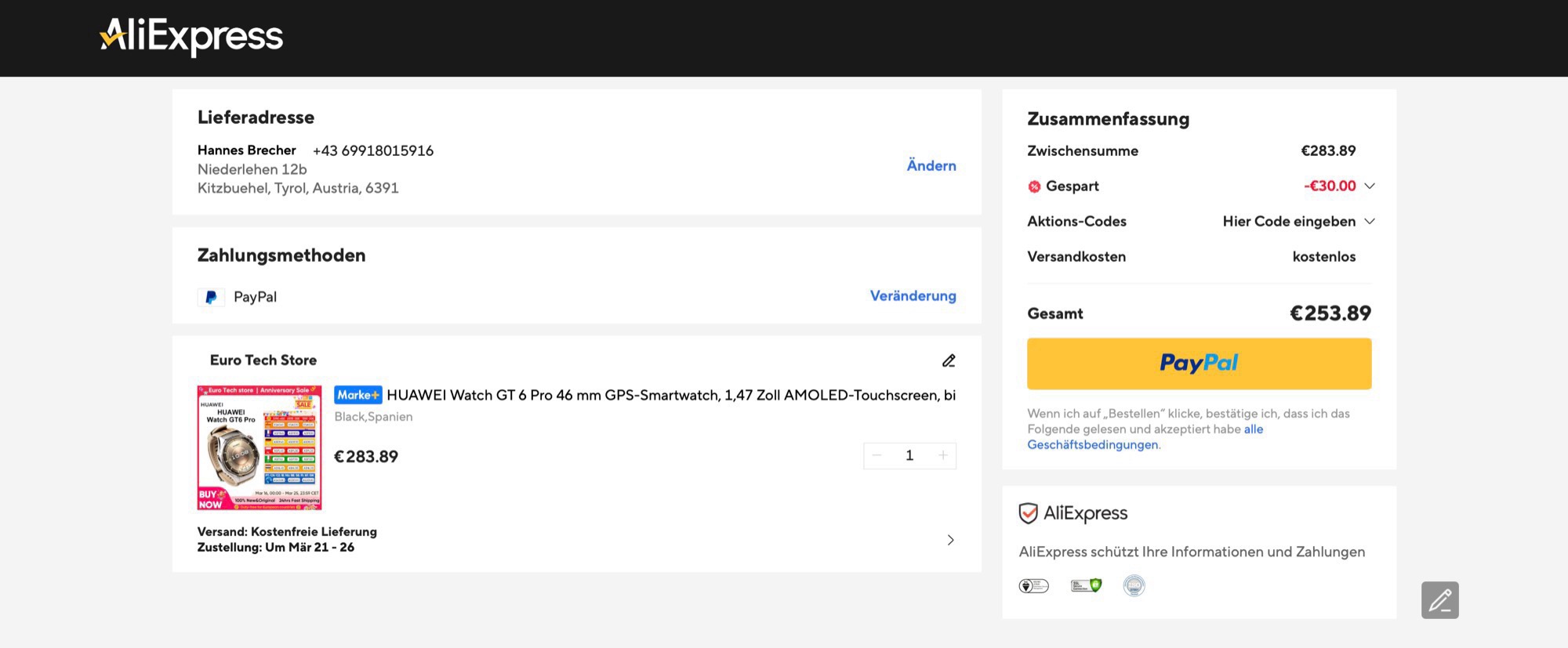 Die Huawei Watch GT 6 Pro wird derzeit bei AliExpress für nur 251,68 Euro angeboten, Kunden aus Österreich bezahlen aufgrund der etwas höheren Mehrwertsteuer 253,89 Euro. Um auf diesen Preis zu kommen, muss der Gutscheincode "AS30VIO" angegeben werden. Der Preis versteht sich inklusive Mehrwertsteuer, der Versand aus Spanien ist kostenlos.