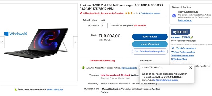 Seit einiger Zeit ist der Surface Pro-Klon Hyrican Enwo Pad wieder für 199 Euro verfügbar, während man das 12,3-Zoll-Tablet inklusive Tastatur-Einheit aktuell für noch günstigere 185 Euro bei Cyberport (eBay-Shop) erhalten kann. Um auf den Preis zu kommen, gibt man den Gutschein-Code "TECHNIK23" im Warenkorb an, der noch bis zum 15.03.23 Gültigkeit besitzt.