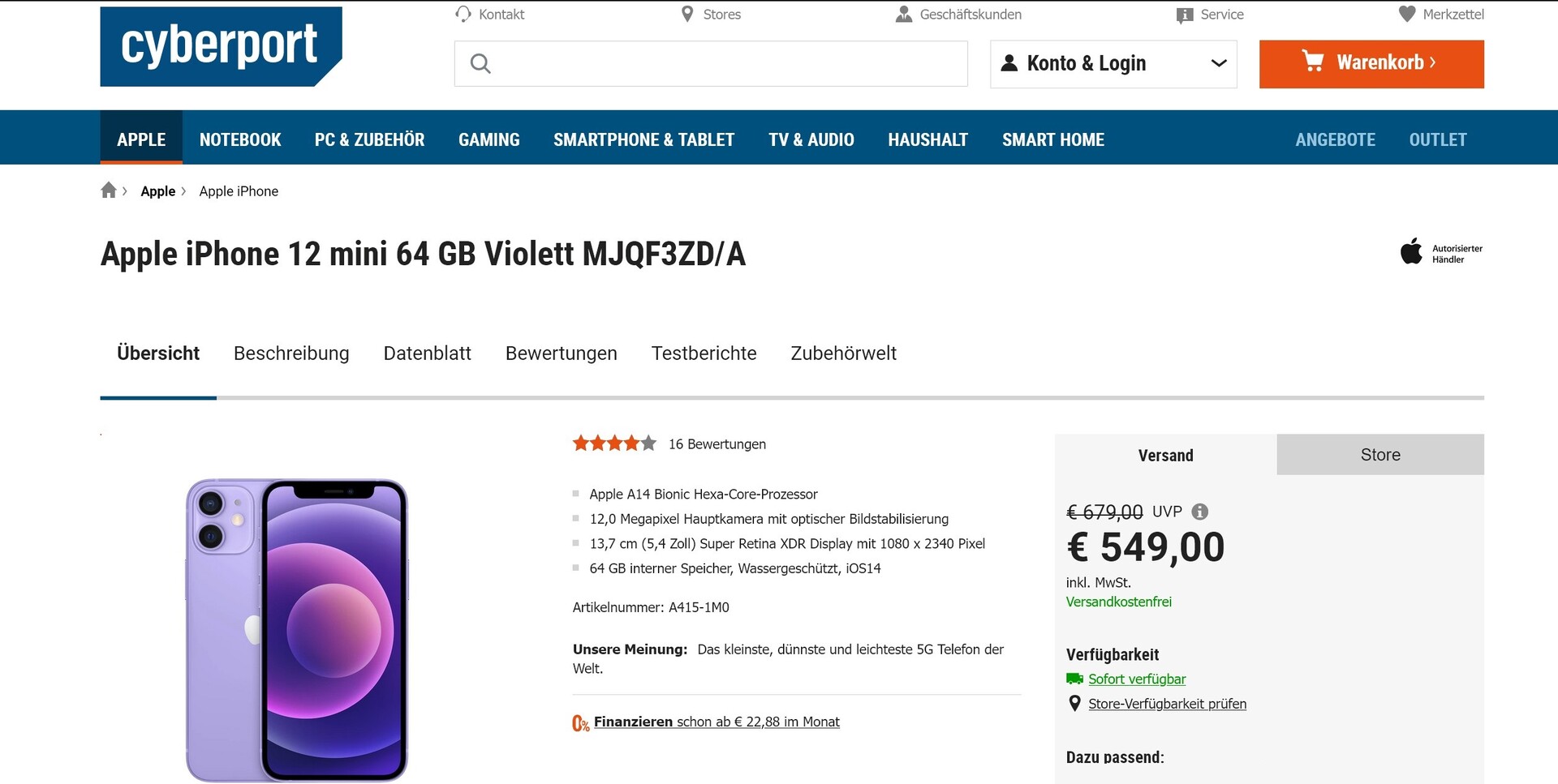 Das iPhone 12 Mini von Apple gibt es mit 20 Prozent Rabatt bei Cyberport zum derzeitigen Bestpreis in der Farbe Violett oder im eBay-Shop "Handyzone_2022" in Schwarz.