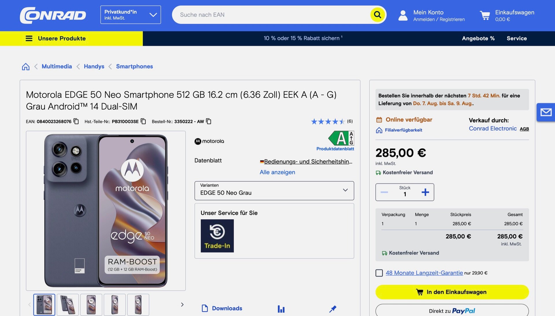 Das Motorola Edge 50 Neo mit 12 GB Arbeitsspeicher und 512 GB Flash-Speicher wird aktuell bei Conrad für nur 242 Euro angeboten, solange der Gutscheincode "DEAL725" angegeben wird, der Versand ist kostenlos. Im Preisvergleich ist das Mittelklasse-Smartphone aktuell nicht unter 270 Euro inklusive Versand zu finden, die unverbindliche Preisempfehlung dieses Modells liegt bei 499,99 Euro.