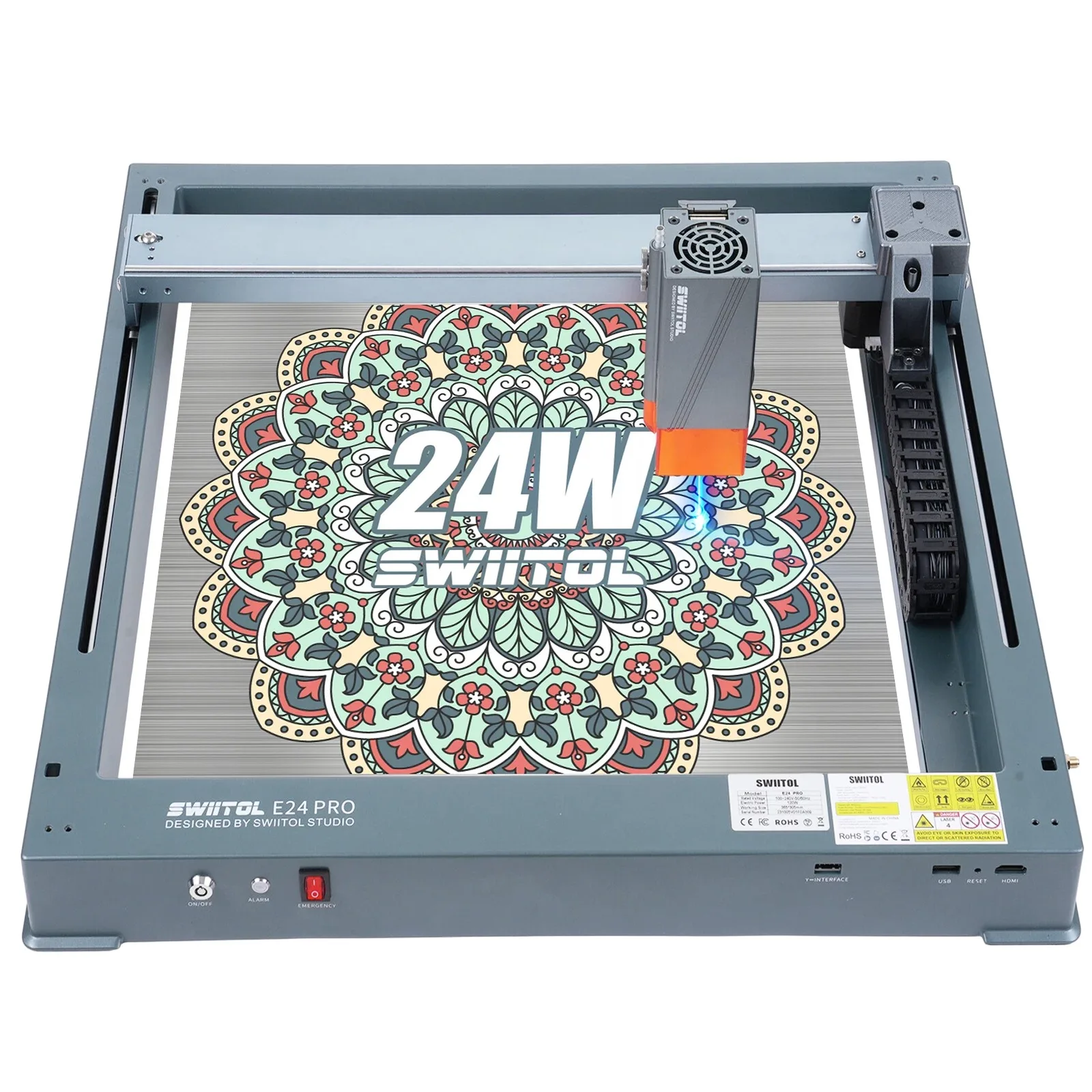 Der Swiitol E24 Pro ist mit einem 24 W starken Laser ausgestattet. Dies ermöglicht neben dem Gravieren auch das Schneiden selbst stärkerer Materialien. Laut Herstellerangaben kann der Lasergravierer unter anderem problemlos 17 mm dickes Lindenholz und 15 mm dickes schwarzes Acryl schneiden und erreicht hierbei mit 36.000 mm/min eine um 40 Prozent höhere Geschwindigkeit als das herkömmliche Modell. Zudem ist das Gerät mit einem Rotlicht-Kreuzpositionierungsmodul bestückt, das den Gravurbereich schneller und genauer positionieren sowie die Ebenheit des Materials bestimmen kann.