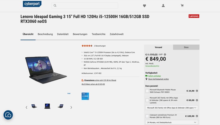 Das Lenovo IdeaPad Gaming 3 kann aktuell bei Cyberport für nur 849 Euro bestellt werden. Im Preisvergleich ist das Gerät ansonsten nicht unter 1.005 Euro zu finden. Damit handelt es sich beim IdeaPad Gaming 3 derzeit um eines der günstigsten Notebooks mit Nvidia GeForce RTX 3060 Laptop-GPU. Die GPU wird mit einer TGP von 105 Watt betrieben.