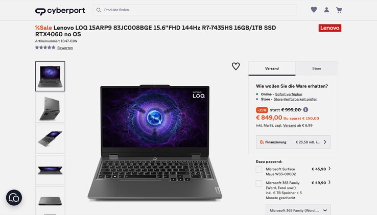 Das Lenovo LOQ 15 kann derzeit bei Cyberport für nur 849 Euro zuzüglich 6,99 Euro Versand bestellt werden. Laut Preisvergleich ist die Variante im Angebot ansonsten nicht unter 933 Euro zu finden, tatsächlich handelt es sich dabei um den neuen Allzeit-Bestpreis für das LOQ 15ARP9.