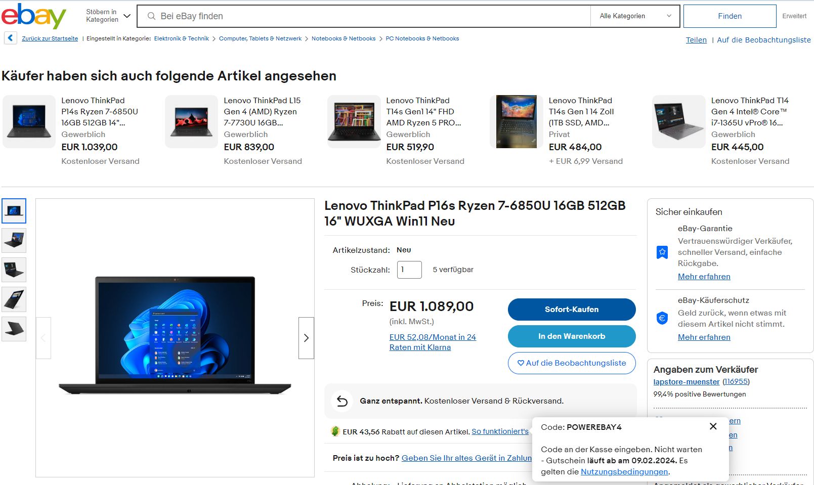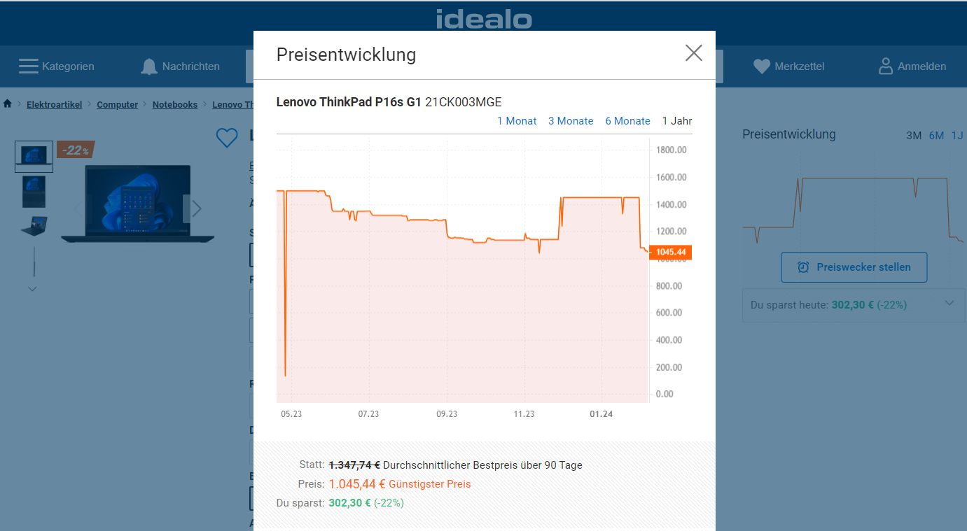 Da die Stückzahl dort begrenzt ist, muss man eventuell auf den regulären Online-Shop des Händlers zurückgreifen, wo das ThinkPad für 1.079 Euro erhältlich ist. Das ist schon sehr nahe am bisherigen Bestpreis dran, während das P16s in genannter Konfiguration bis Ende Januar laut Idealo noch 1.449 Euro gekostet hat.
