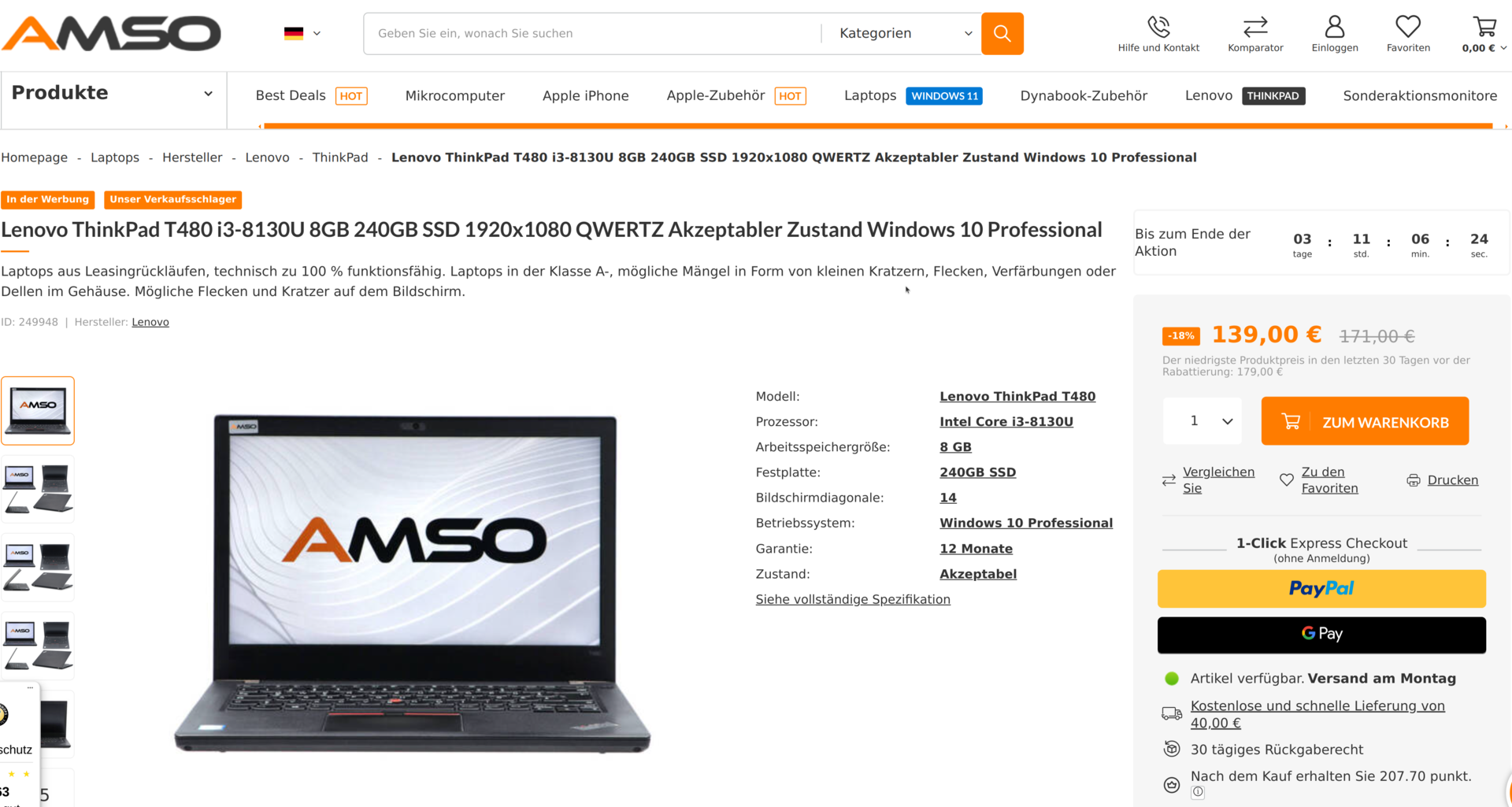 Vor rund zwei Wochen gabs das Lenovo ThinkPad T480 Business-Notebook bereits für günstige 179 Euro im Angebot, jetzt topt AMSO den Deal um weitere 40 Euro und zwar diesmal mit FullHD-IPS-Panel statt HD+ TN-Display aus dem letzten Angebot.