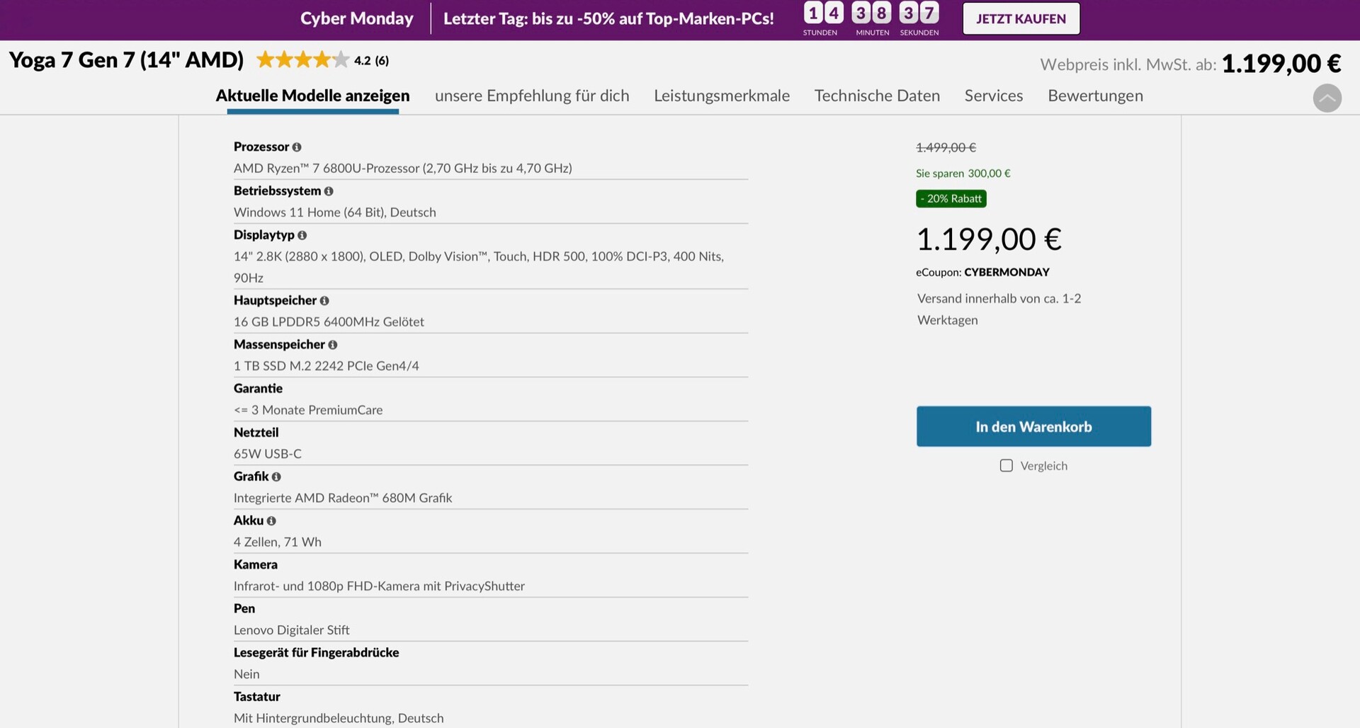 Das Lenovo Yoga 7 14 Gen 7 kann aktuell direkt über die Webweite von Lenovo für nur 1.199 Euro bestellt werden, statt der 1.499 Euro, die im Preisvergleich bis vor dem Black Friday fällig wurden. Dabei handelt es sich um die am besten ausgestattete Variante des Geräts auf Basis des AMD Ryzen 7 6800U mit acht Kernen, 16 Threads und Taktfrequenzen bis 4,7 GHz.