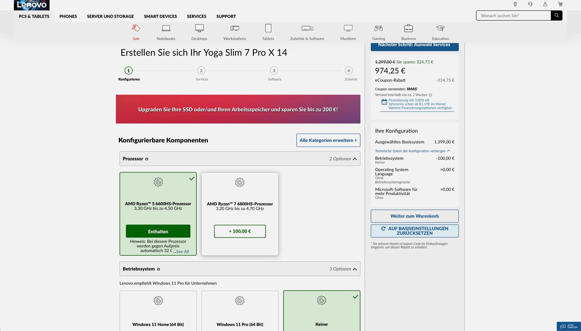 Das Lenovo Yoga Slim 7 Pro X kann aktuell über die Webseite von Lenovo zu Preisen ab 974,25 Euro bestellt werden, der dazu notwendige Gutscheincode "XMAS" sollte automatisch angewendet werden. Für diesen Preis erhalten Kunden das Notebook mit einem AMD Ryzen 5 6600HS mit sechs Kernen und integrierter Radeon 660M mit 6 Compute Units.