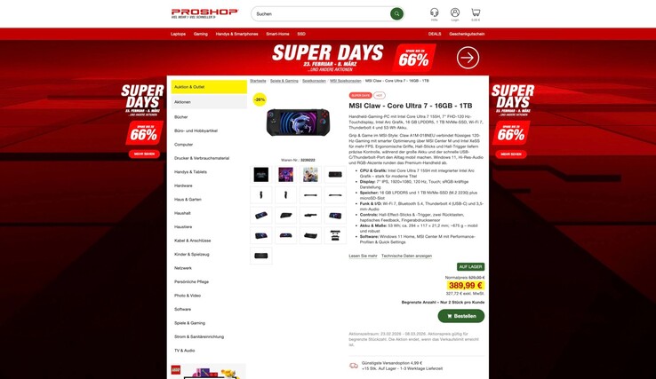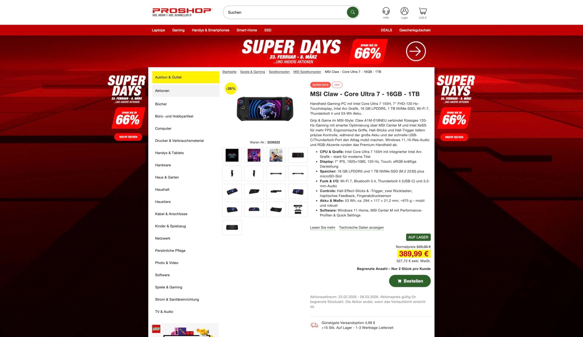 Das MSI Claw wird aktuell bei ProShop für 389,99 Euro zuzüglich 4,99 Euro Versand angeboten. Der Gaming-Handheld wurde von eben diesem Shop im Januar bereits kurze Zeit zu diesem Preis angeboten, war im Preisvergleich bis zum Start dieser neuen Aktion aber nicht unter 529 Euro zu finden.