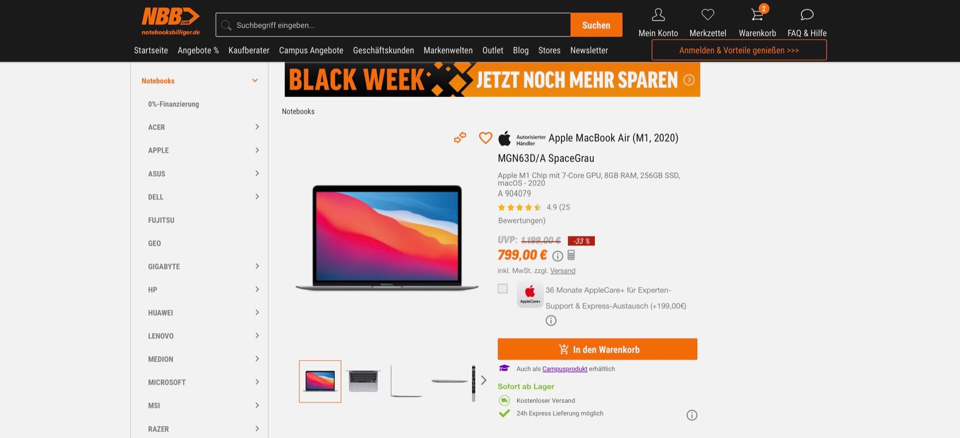 Es handelt sich beim Modell im Angebot um das MacBook Air aus dem Jahr 2020, das regulär für eine unverbindliche Preisempfehlung von 1.199 Euro angeboten wird. Auch nach zweieinhalb Jahren am Markt bietet das MacBook Air zum Bestpreis ein spannendes Preis-Leistungs-Verhältnis, denn der Apple M1 bietet nach wie vor eine ordentliche Performance, nicht nur für Office-Aufgaben und Surfen im Web, sondern auch für gelegentliches Foto-Bearbeiten und Videoschnitt. Apple verbaut im angebotenen Modell 8 GB RAM und eine 256 GB fassende SSD.