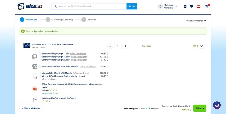 Das MacBook Air mit Apple M4, 16 GB Arbeitsspeicher und einer 256 GB SSD wird aktuell bei MediaMarkt Österreich für nur 747 Euro angeboten, entweder mit Lieferung innerhalb Österreichs für 3,99 Euro, oder mit kostenloser Abholung in einer Filiale. Alza Österreich bietet das Notebook mit dem Gutscheincode "ALZADAYS10AT" für 746 Euro an, der Versand kostet 4,49 Euro.
