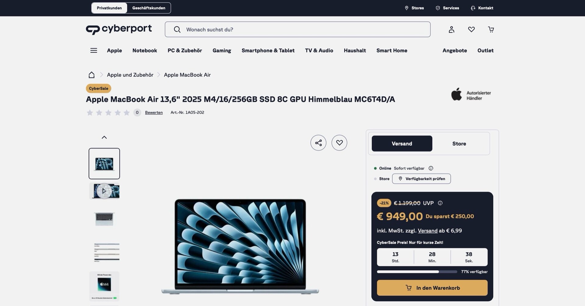 Das MacBook Air mit Apple M4, 16 GB Arbeitsspeicher und 256 GB SSD wird aktuell im Cyberport Cybersale für nur 949 Euro angeboten, zuzüglich 6,99 Euro Versandkosten. Laut Preisvergleich handelt es sich dabei um den Allzeit-Bestpreis für das Modell im Angebot, das aktuell ansonsten nicht unter 991 Euro inklusive Versand zu bekommen ist. Apple veranschlagt für den gleichen Laptop 1.199 Euro. Diese Aktion gilt allerdings nur noch bis zum Mittwoch, dem 30. Juli, um 09:00 Uhr, oder solange der Vorrat reicht.