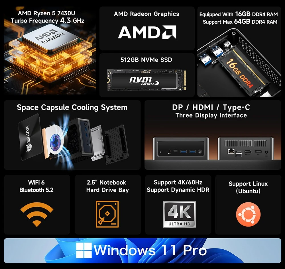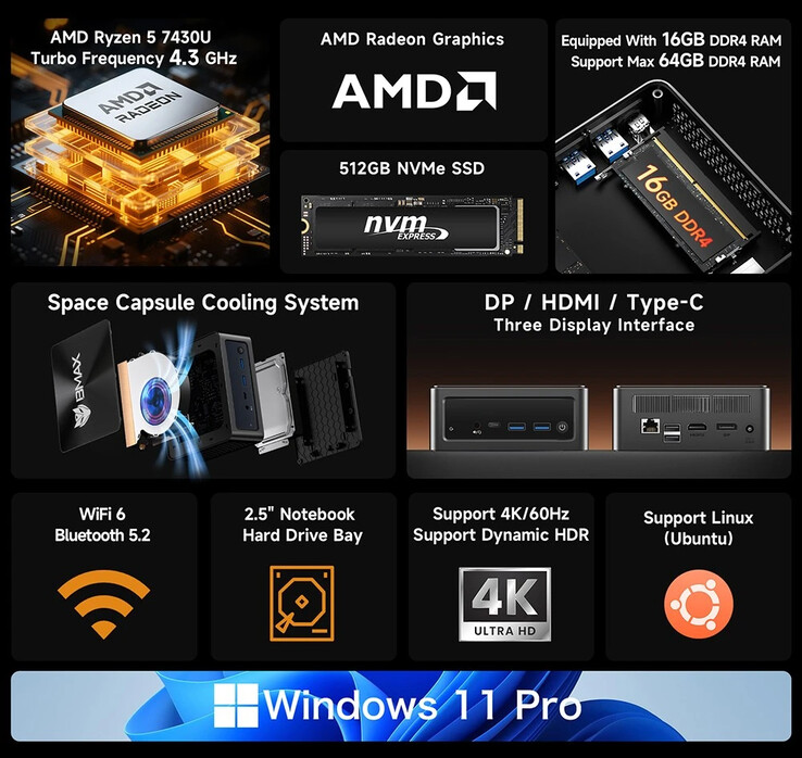 Der Bmax B7A Pro ist ein klassischer Mini-PC, der in einem nur rund 12 x 12 x 5 cm messenden Gehäuse viel Leistung und Ausstattung versteckt. Angetrieben wird der kompakte Computer vom AMD Ryzen 5 7430U. Die CPU sorgt mit sechs Kernen, 12 Threads sowie einem Spitzentakt von 4,3 GHz für viel Rechenleistung. Gemeinsam mit 16 GB DDR4 RAM (auf maximal 64 GB erweiterbar) sowie einer 512 GB NVMe SSD ergibt sich ein performantes System, das mit Windows 11 läuft.