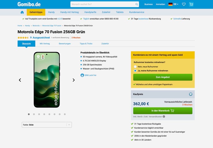 Das Motorola Edge 70 Fusion wird aktuell bei Gomibo Deutschland für nur 362 Euro zuzüglich 1,95 Euro Versand angeboten, oder aber bei Gomibo Österreich für 365 Euro mit kostenlosem Versand. Es handelt sich dabei um die Version in Grün mit 256 GB Speicher und 7.000 mAh Akku, statt der 5.200 mAh Version des Mittelklasse-Smartphones.