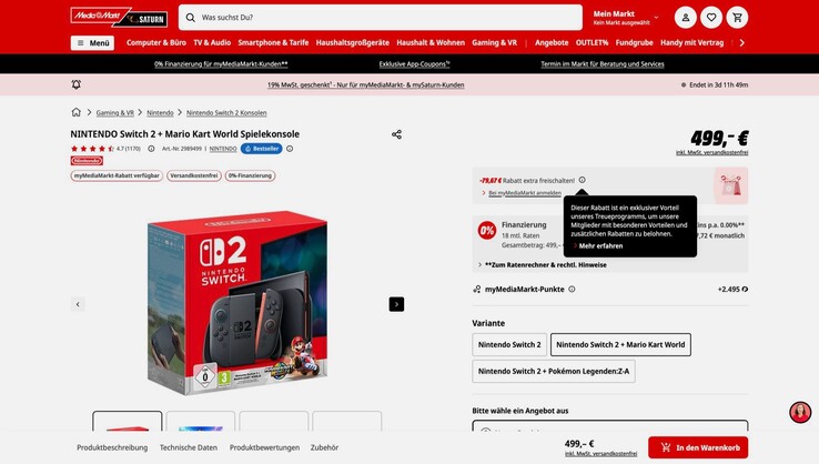 Die Nintendo Switch 2 wird derzeit bei MediaMarkt zum Bestpreis angeboten, wahlweise ohne Spiel für 394 Euro, oder im Bundle mit einer Download-Version von Mario Kart World für 419 Euro. Der Versand ist innerhalb Deutschlands kostenlos. Um die Konsole zu diesem Preis kaufen zu können, muss zuvor ein kostenloses myMediaMarkt-Konto angelegt werde.