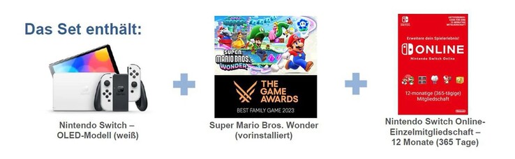 Selbst die Konsole ohne Spiel ist derzeit nicht unter 299 Euro zu finden. Das Bundle umfasst das Nintendo Switch (OLED-Modell) mit weißen Joy-Con, eine digitale Kopie von Super Mario Bros. Wonder im Wert von 59,99 Euro und ein zwölf Monate gültiges Nintendo Switch Online Abonnement, das ansonsten 19,99 Euro kostet. Das OLED-Modell unterscheidet sich vor allem durch das hellere 7 Zoll OLED-Display von der regulären Nintendo Switch, bietet aber auch verbesserte Lautsprecher, einen auf 64 GB verdoppelten Speicher und einen breiteren, stufenlos verstellbaren Standfuß.