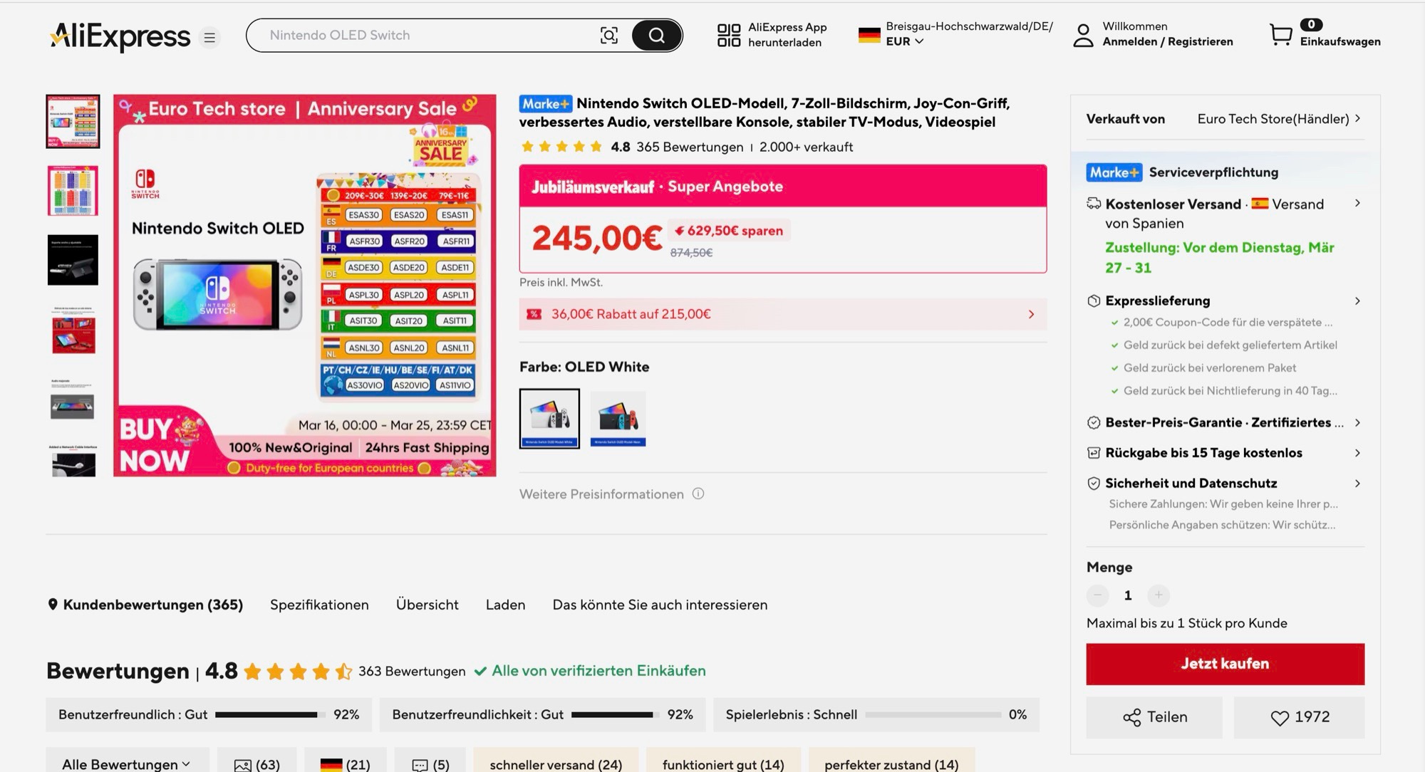 Die Nintendo Switch OLED wird derzeit auf AliExpress für nur 194,66 Euro angeboten. Der Preis versteht sich inklusive Mehrwertsteuer und kostenlosem Versand aus Spanien, gilt aber nur dann, wenn sich die Lieferadresse in Deutschland befindet.