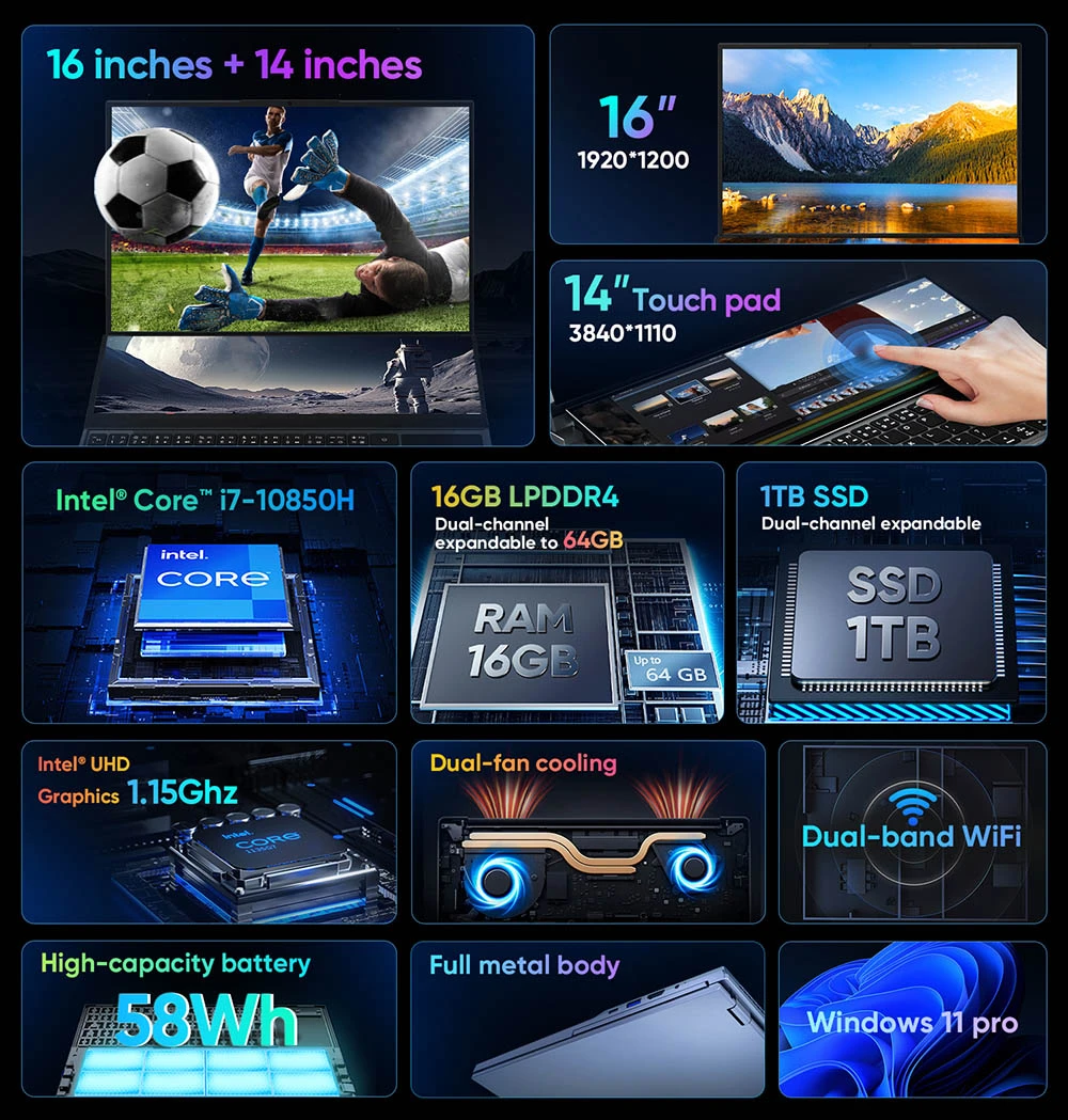 Für lange Akkulaufzeit sorgt ein 58 Wh großer Akku. Zur weiteren Ausstattung des N-one NBook Fly zählen unter anderem Dual-Band-WLAN ac und Bluetooth 4.2. Für kabelgebundene Konnektivität stehen ein Anschluss für externe Grafikkarten, diverse USB-Ports sowie HDMI und eine Kopfhörerbuchse zur Verfügung. Als Betriebssystem installiert der Hersteller Windows 11 Pro auf dem 2,5 kg wiegenden und aktuell für nur 749 Euro erhältlichen Dual-Screen-Notebook N-one NBook Fly.
