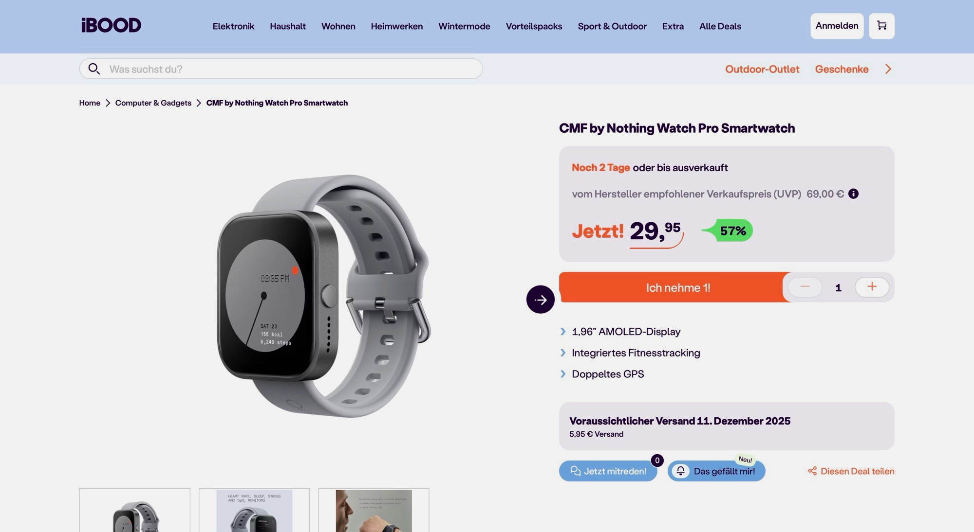 Die CMF Watch Pro wurde im September 2023 angekündigt, und wurde zum Launch für 69 Euro angeboten. Derzeit wird die Smartwatch bei iBood für nur 29,95 Euro zuzüglich 5,95 Euro Versand angeboten, also für insgesamt 35,90 Euro. Laut Preisvergleich handelt es sich dabei um den neuen Allzeit-Bestpreis für die Smartwatch, die noch nie unter 38 Euro plus Versand zu bekommen war.