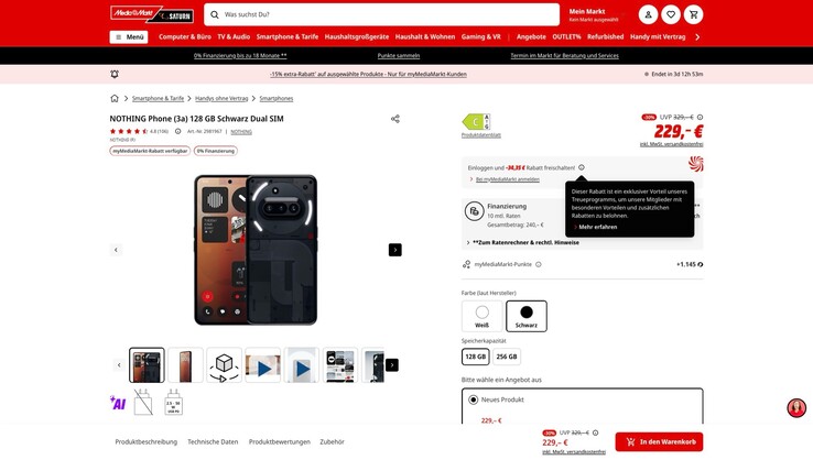 Das Nothing Phone (3a) in der Farbe Schwarz mit 8 GB Arbeitsspeicher und 128 GB Flash-Speicher gibts aktuell bei MediaMarkt für nur 195 Euro, vorausgesetzt, es wird ein kostenloser MyMediaMarkt-Account angelegt. Laut Preisvergleich war das Mittelklasse-Smartphone noch nie zuvor für unter 229 Euro zu bekommen.