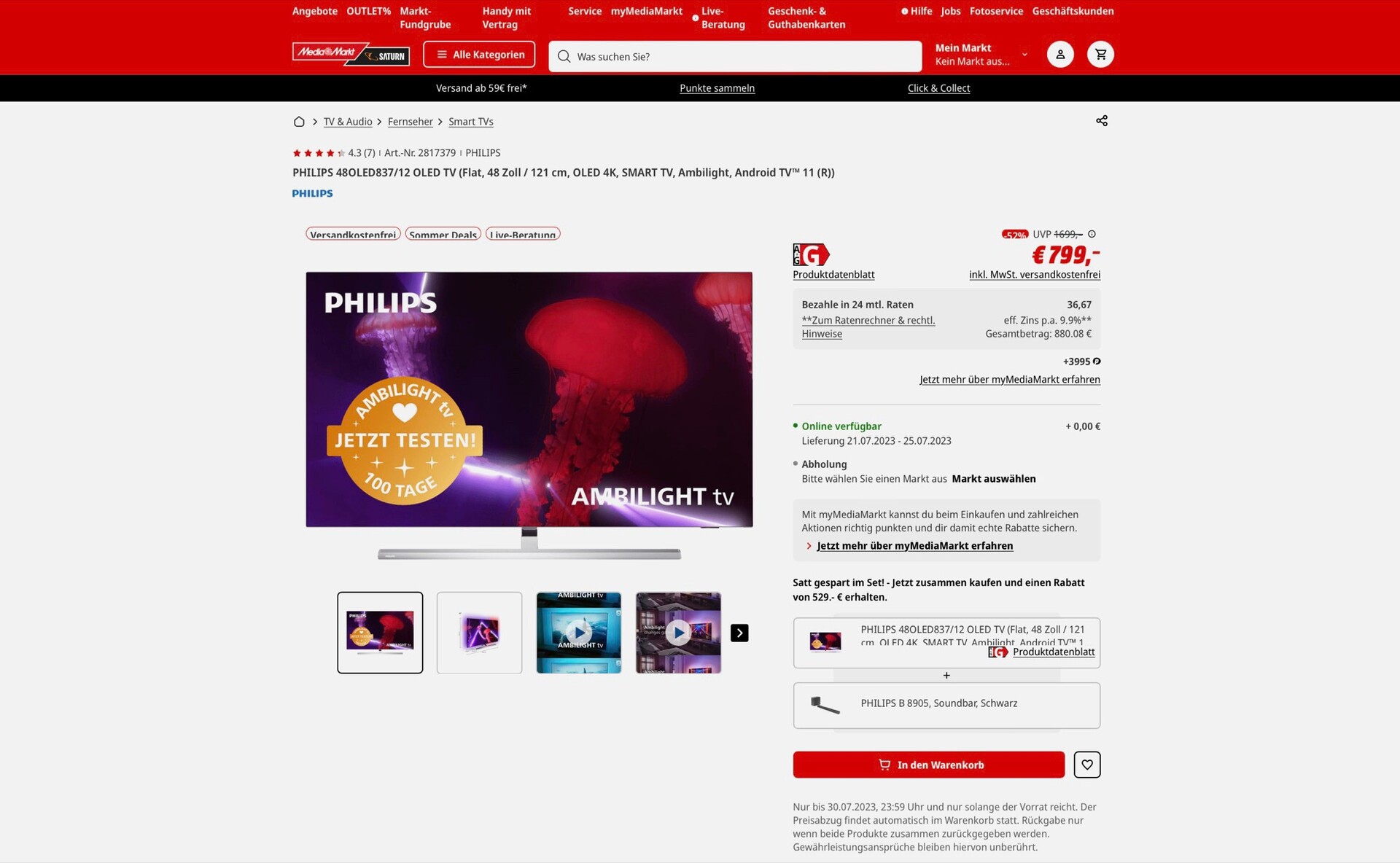 MediaMarkt bietet den Philips 48OLED837 Smart TV derzeit für nur 799 Euro an – ein Bestpreis, vor dieser Aktion war der Fernseher im Preisvergleich nicht unter 1.069 Euro zu finden. Wer die TAB8905 Soundbar zusammen mit dem Fernseher bestellt, erhält diese kostenlos, statt der mindestens 482 Euro, die ansonsten für diese Soundbar fällig werden.