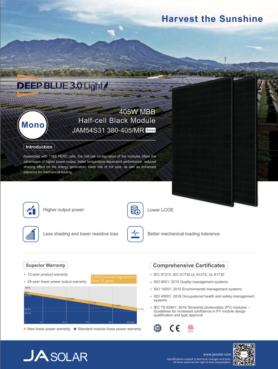 Die 2-kWp-Solaranlage kommt mit fünf monokristallinen Halbzellen-Solarmodulen JAM54S31-405/MR von Ja Solar in Full-Black, einem Growatt-MIC-2000TL-X-Wechselrichter mit 2 kW und einem Wi-Fi-Stick Growatt-Shinewifi-X, um den Hybrid-Wechselrichter mit dem Internet zu verbinden und die Daten der PV-Module auszulesen.