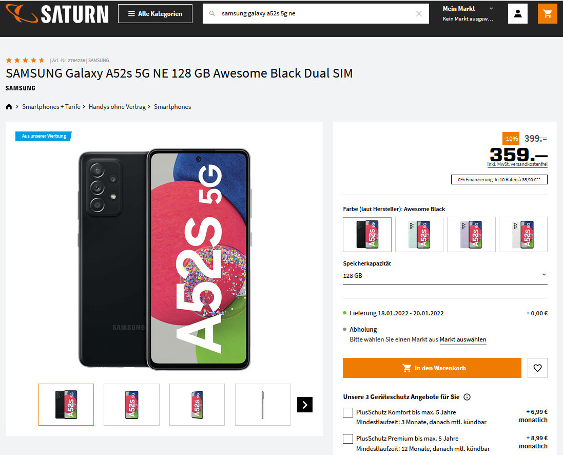 Für das hochwertige Mittelklassehandy Galaxy A52s 5G NE von Samsung wollen die Elektrofachmärkte Media Markt und Saturn jeweils 359 Euro statt 399 Euro haben. Im Test Samsung Galaxy A52s 5G Smartphone lieferte das 5G-Handy von Samsung eine "gute" Gesamtperfomance und erzielte 85 Prozent. Das 5G-Smartphone überzeugte unter anderem mit einem schnellen und hellen Display, IP-Zertifizierung und langen Laufzeiten