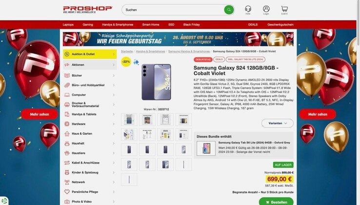 Das Samsung Galaxy S24 kann derzeit bei Proshop in einem Bundle mit einem Samsung Galaxy Tab S6 Lite (2024) (ca. 240 Euro auf Amazon) bestellt werden. Das Paket kostet mit einem Galaxy S24 mit 128 GB Speicher 699 Euro, mit einem Galaxy S24 mit 256 GB Speicher veranschlagt Proshop 749 Euro.