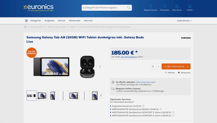 Euronics bietet aktuell ein Bundle bestehend aus Samsung Galaxy Tab A8 und Galaxy Buds Live zum Preis von 185 Euro an, zuzüglich 4,99 Euro Versand, oder aber Abholung in einer Filiale. Im Preisvergleich kostet das Galaxy Tab A8 in Deutschland derzeit mindestens 177 Euro, die Galaxy Buds Live sind nicht unter 57 Euro zu finden, sodass dieses Bundle eine Ersparnis von immerhin 49 Euro ermöglicht.