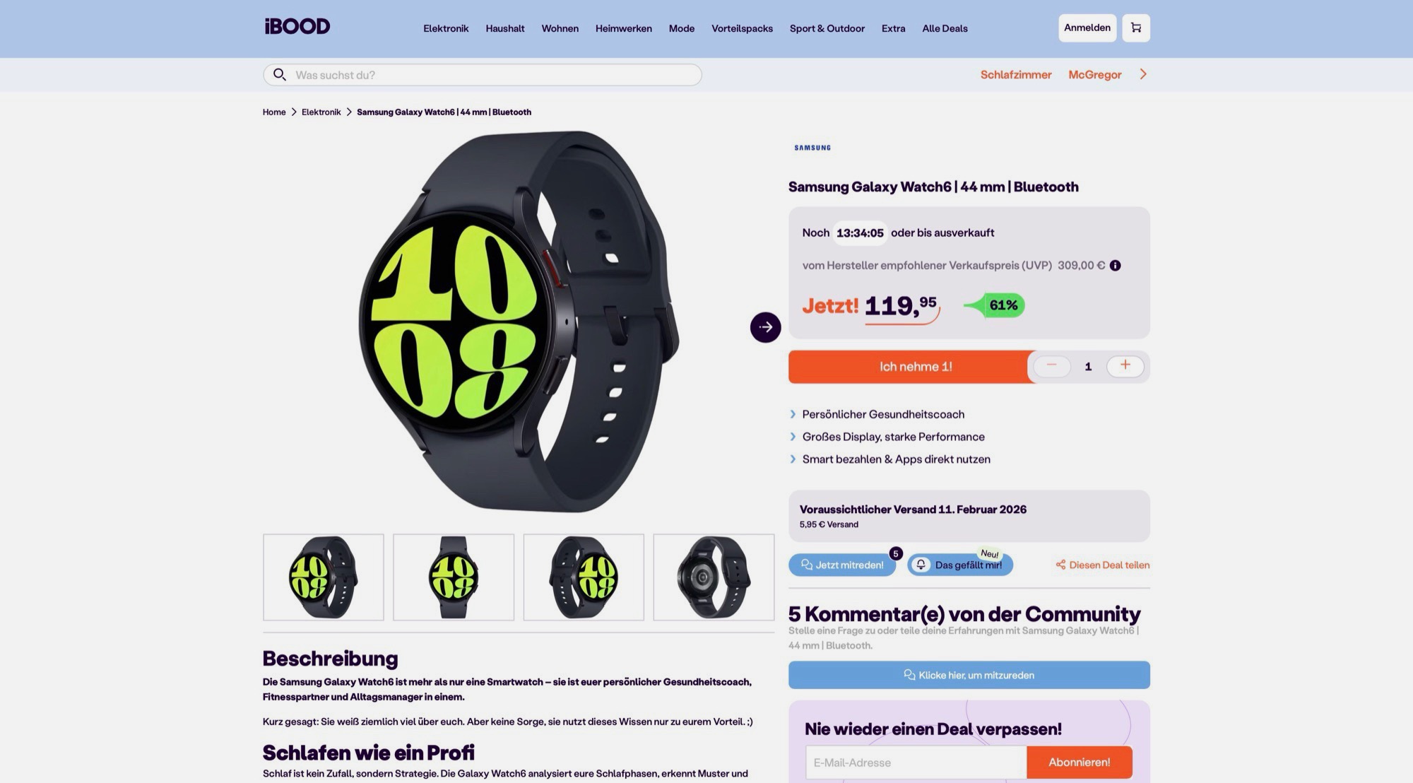 Die Samsung Galaxy Watch6 in Schwarz mit einem Gehäuse-Durchmesser von 44 Millimetern kostet aktuell auf iBood nur 119,95 Euro zuzüglich 5,95 Euro Versandkosten. Dieses Angebot gilt nur bis Mitternacht, oder solange der Vorrat reicht. Laut Preisvergleich handelt es sich dabei um den Allzeit-Bestpreis für die Smartwatch, die derzeit ansonsten nicht für unter 160 Euro zu bekommen ist.