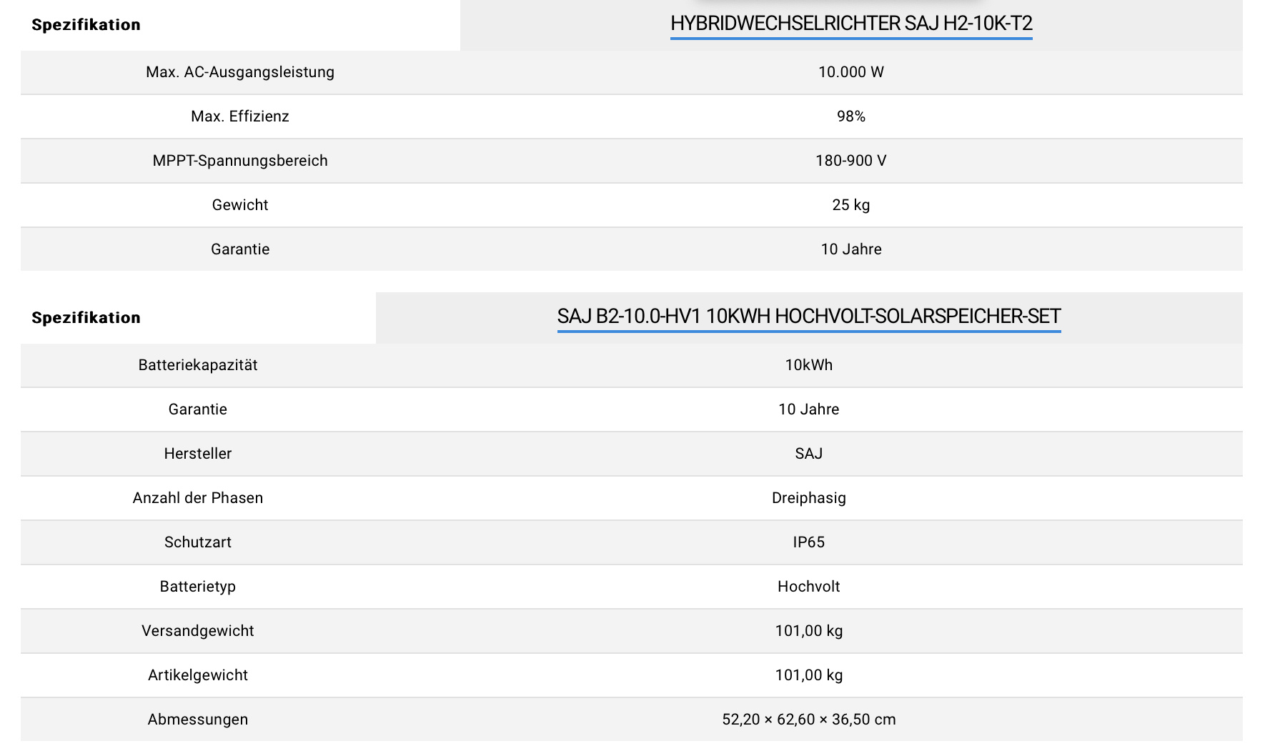 Darüber hinaus gibt es ein dreiphasiges Hochvoltspeicher-Set SAJ B2-10.0-HV1 mit einer Kapazität von 10 kWh und einen Hybrid-Wechselrichter SAJ H2-10K-T2 mit einem maximalen Wirkungsgrad von 98 Prozent und einer AC-Ausgangsleistung von 10.000 Watt inklusive Smart-Meter. Der Wechselrichter ist mit einer Notstromfunktion ausgestattet, sodass auch bei einem Stromausfall eine unterbrechungsfreie Stromversorgung gewährleistet ist.