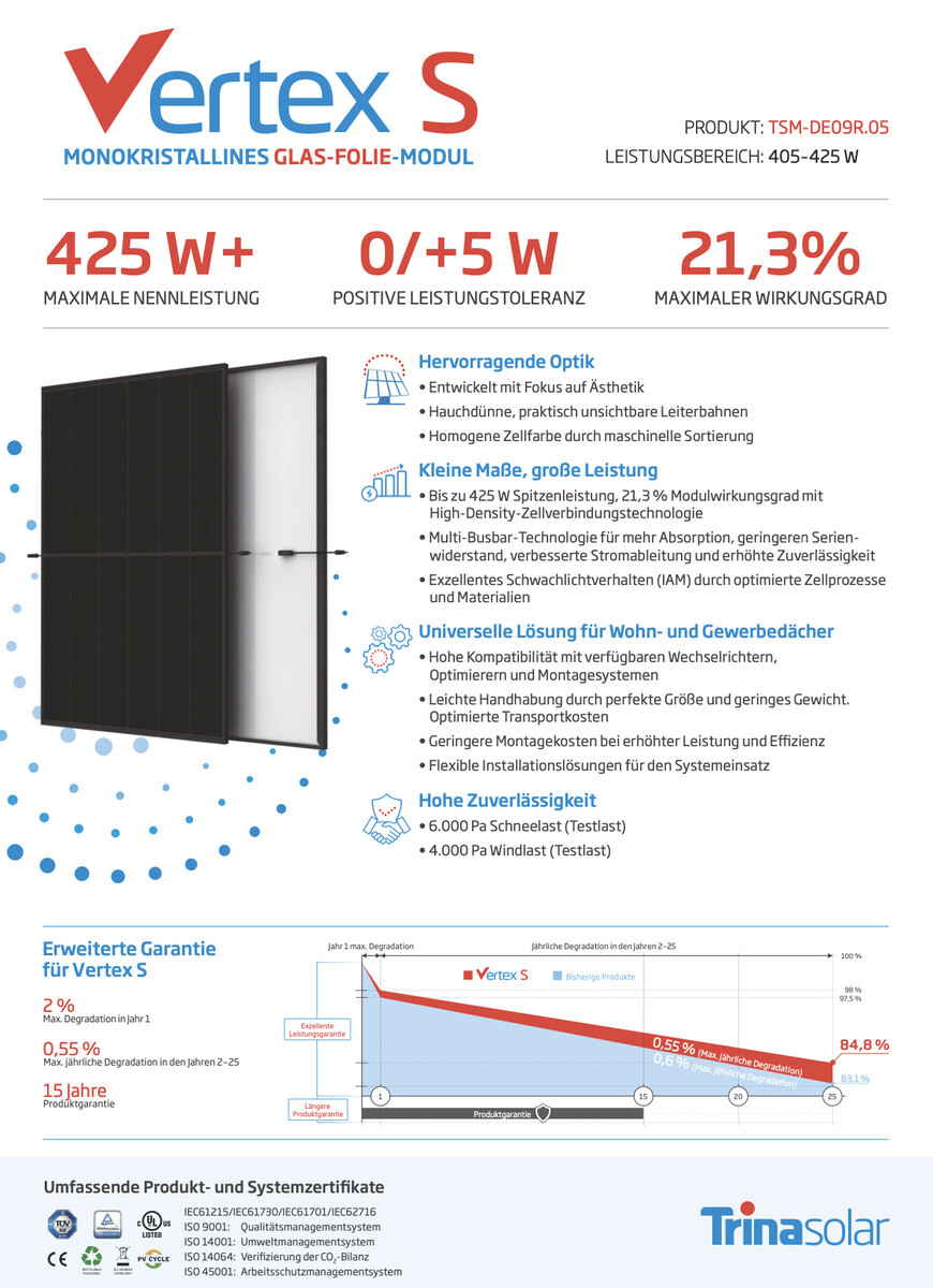 Im Lieferumfang enthalten sind 25 Solarmodule Trina Vertex S TSM-415-DE09R.05 in Full Black mit je 415 Wp und einem Wirkungsgrad von über 20,8 Prozent. Die Rahmenhöhe beträgt 30 mm, die Modulbreite 1.134 mm und die Modullänge 1.762 mm bei einem Gewicht von jeweils 21,8 kg. Der Hersteller gewährt 25 Jahre Leistungsgarantie und 15 Jahre Produktgarantie.