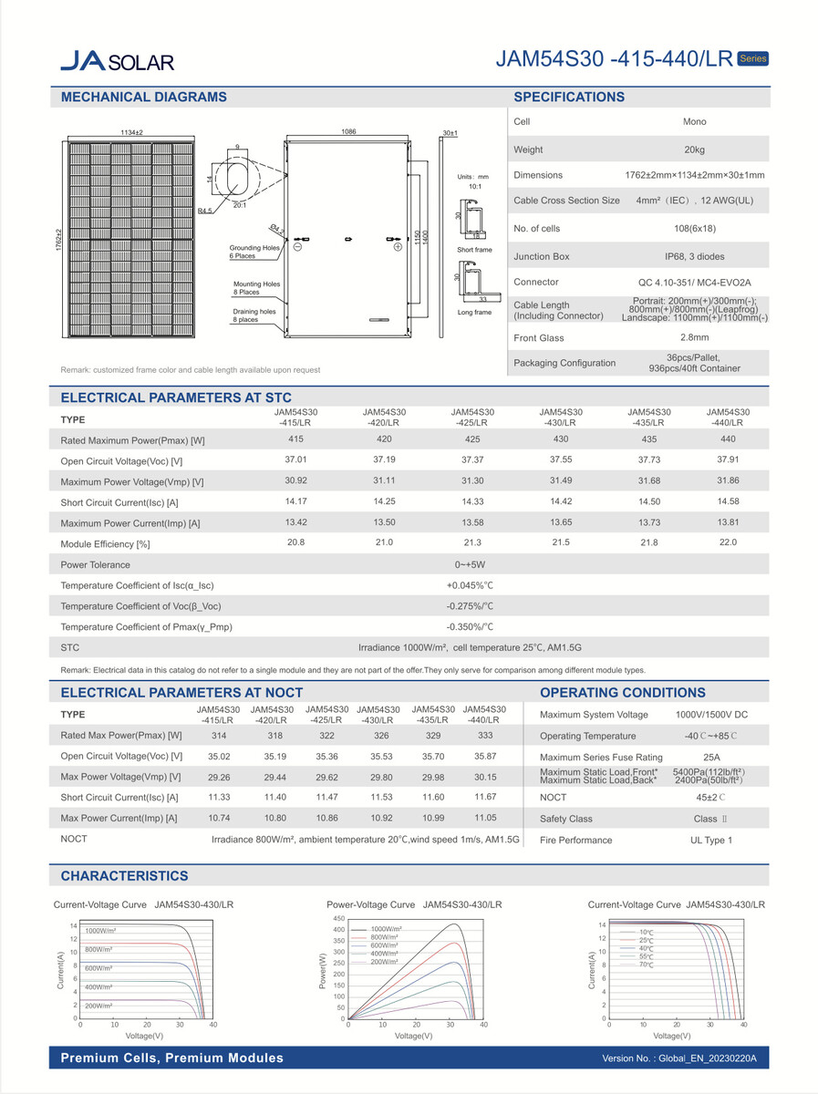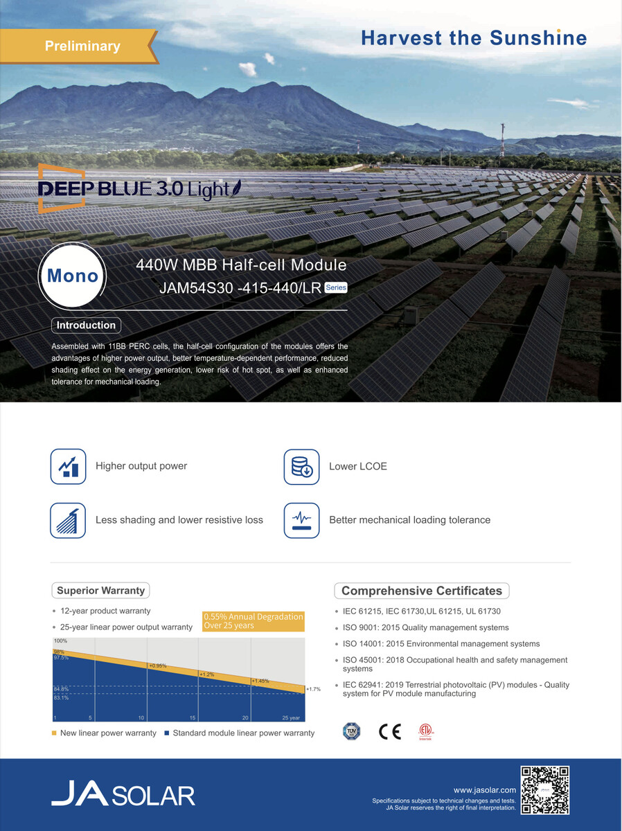 Im Lieferumfang enthalten sind 26 Solarmodule Ja Solar JAM54S30-420/LR mit schwarzem Rahmen. Im Text auf der Website des Händlers steht, die Module hätten eine Leistung von 420 Wp, tatsächlich sind es aber nur 415 Wp. Die Solarpanels sind mit einer 12-jährigen Produktgarantie und einer 25-jährigen linearen Leistungsgarantie des Herstellers ausgestattet.