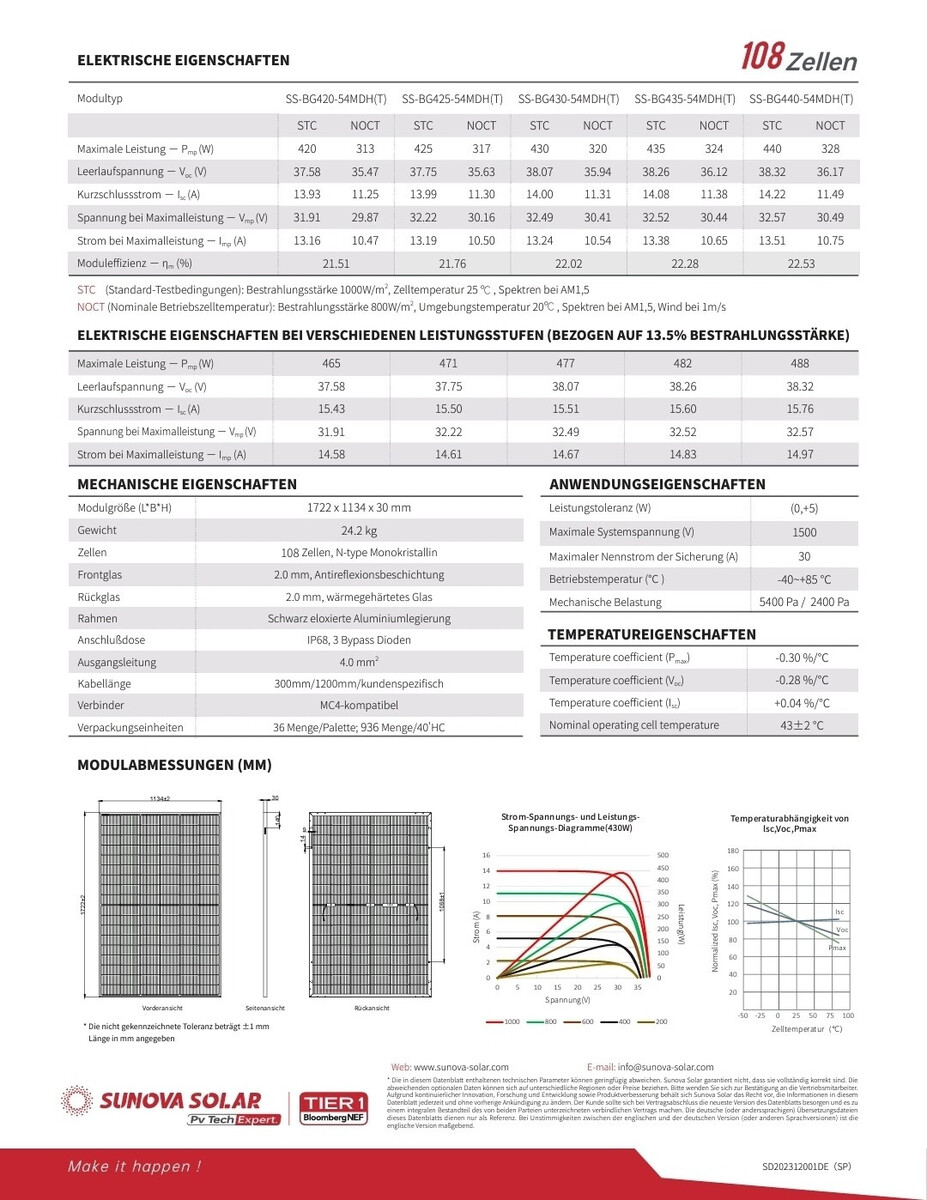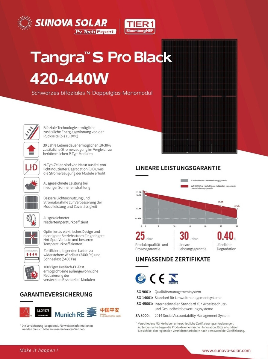 Als Solarmodule können die im Paket enthaltenen oder gegen Aufpreis andere Module, beispielsweise von Ja Solar, gewählt werden. Bei den standardmäßig enthaltenen Solarmodulen handelt es sich um 24 bifaziale Glas-Glas-Module in Full Black des Tier-1-Herstellers Sunova-Solar mit einer Leistung von jeweils 430 Wp und moderner N-Typ-Technologie. Die Solarpanels mit einer Größe von 1.722 x 1.134 x 30 mm und einem Gewicht von jeweils 24,2 kg werden mit einer Herstellergarantie von 25 Jahren geliefert.