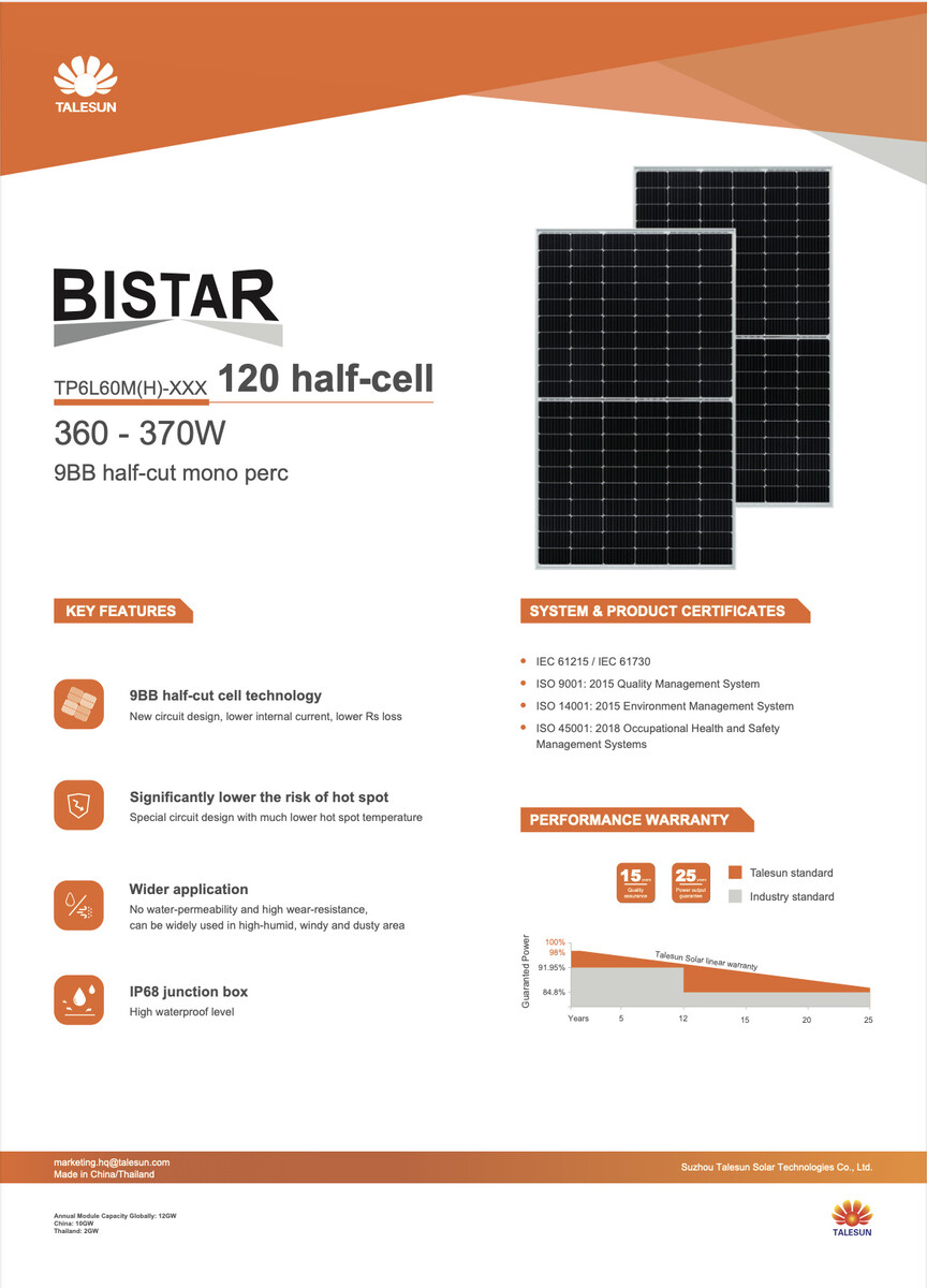 Die Solaranlage ist mit 31 Solarmodulen der neueren und effizienteren Generation von Talesun TP6L60M mit einer Leistung von jeweils 370 Wp und je 120 Halbzellen ausgestattet. Die kompakten Module mit schickem silbernem Rahmen haben einen Wirkungsgrad von 20,3 Prozent und sind 1.755 x 1.038 x 35 mm groß.