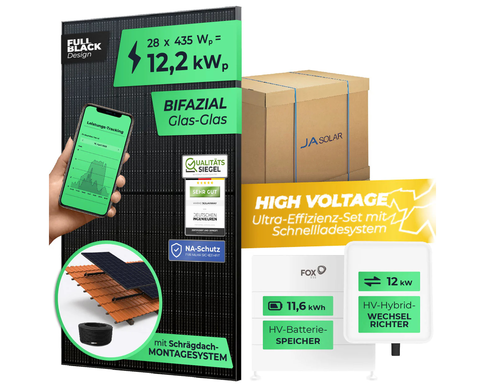 Außerdem enthält das Set einen Hybridwechselrichter Fox ESS H3-12.0-E mit einer Ausgangsleistung von 12 kW sowie einen Hochvolt-Batteriespeicher der Marke Fox ESS mit 4 Modulen ECS2900 mit je 2,9 kWh Speicherkapazität (insgesamt 11,6 kWh). Ebenfalls im Lieferumfang inbegriffen ist ein 100 m langes Solarkabel H1Z2Z2-K (⌀ 6 mm²).