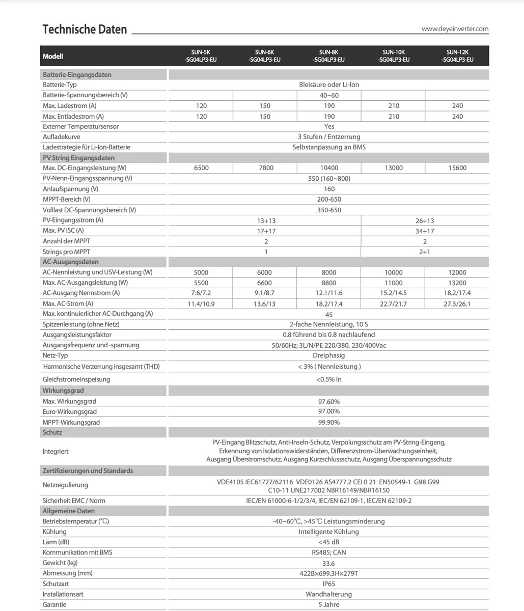 So können beispielsweise zusätzliche Energiequellen wie Notstromaggregate, ein vorhandenes Balkonkraftwerk oder eine Windkraftanlage als weitere Stromquelle eingebunden werden, um bei Bedarf eine noch höhere Energieeffizienz zu bieten. Zum Set gehören auch drei kobaltfreie Batteriespeicher Deye SE-G5.1 Pro mit je 5,1 kWh Speicherkapazität (insgesamt 15,3 kWh) und LiFePO4-Akkuzellen sowie 10 Jahren Herstellergarantie.