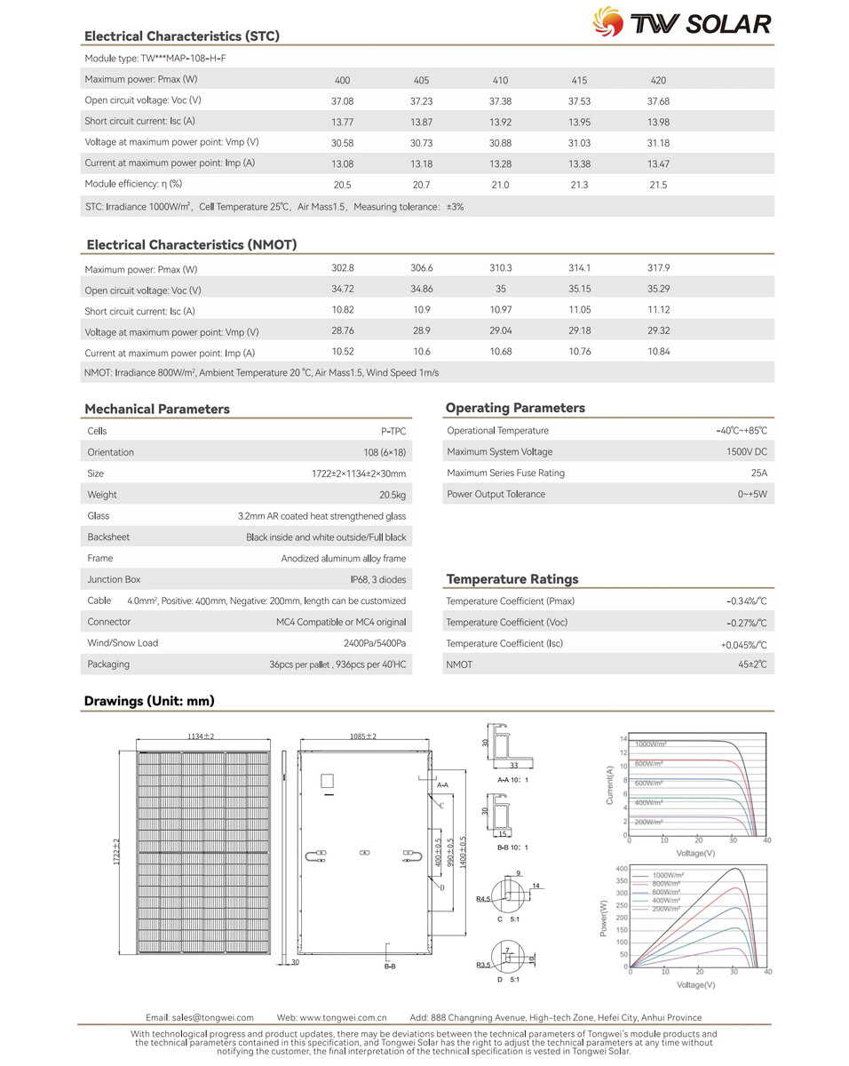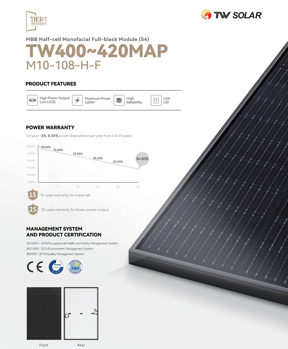 Zum Lieferumfang gehören 72 Solarmodule mit je 400 Wp in Full Black des Tier-1-Herstellers TW-Solar TW400-H-F. Die monokristallinen Glas-Folie-Module haben eine Herstellergarantie von 12 Jahren, eine Größe von 1.722 x 1.134 x 30 Millimeter und ein Gewicht von 20,5 Kilogramm pro Modul.