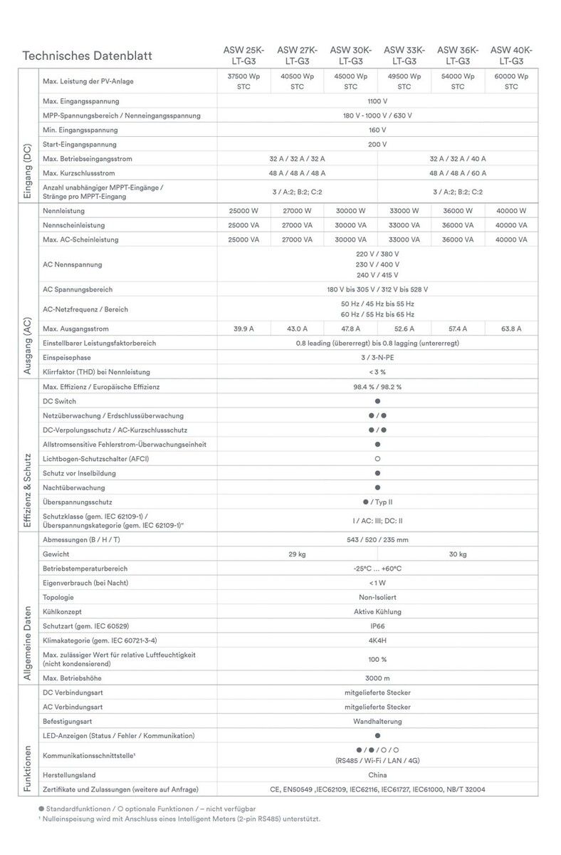Der ASW25K-LT-G3 ist ein reiner Solarwechselrichter und kein Hybridwechselrichter. Das heißt, er ist ausschließlich dafür ausgelegt, den von einer Photovoltaikanlage erzeugten Gleichstrom in nutzbaren Wechselstrom umzuwandeln und in das öffentliche Netz einzuspeisen. Er hat keine Schnittstelle für den Anschluss von Batterien.