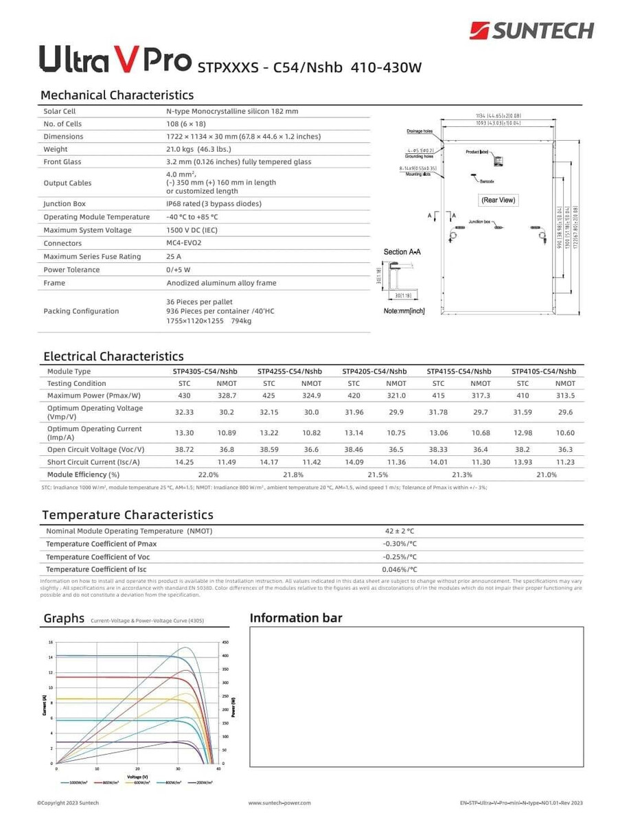 Zum Lieferumfang gehören 20 Glas-Folie-Module in schickem Full Black mit TOPCon-Solarzellen für höhere Wirkungsgrade sowie N-Typ für geringeren temperaturbedingten Leistungsabfall, bessere Schwachlichtperformance sowie längere Lebensdauer. Außerdem haben die Solarmodule des Tier-1-Herstellers Suntech eine Leistung von jeweils 420 Wp, messen 1.722 x 1.134 x 30 mm und bringen jeweils 21 kg auf die Waage. Der Hersteller gewährt 15 Jahre Garantie auf Produktqualität und Verarbeitung sowie 25 Jahre lineare Leistungsgarantie.