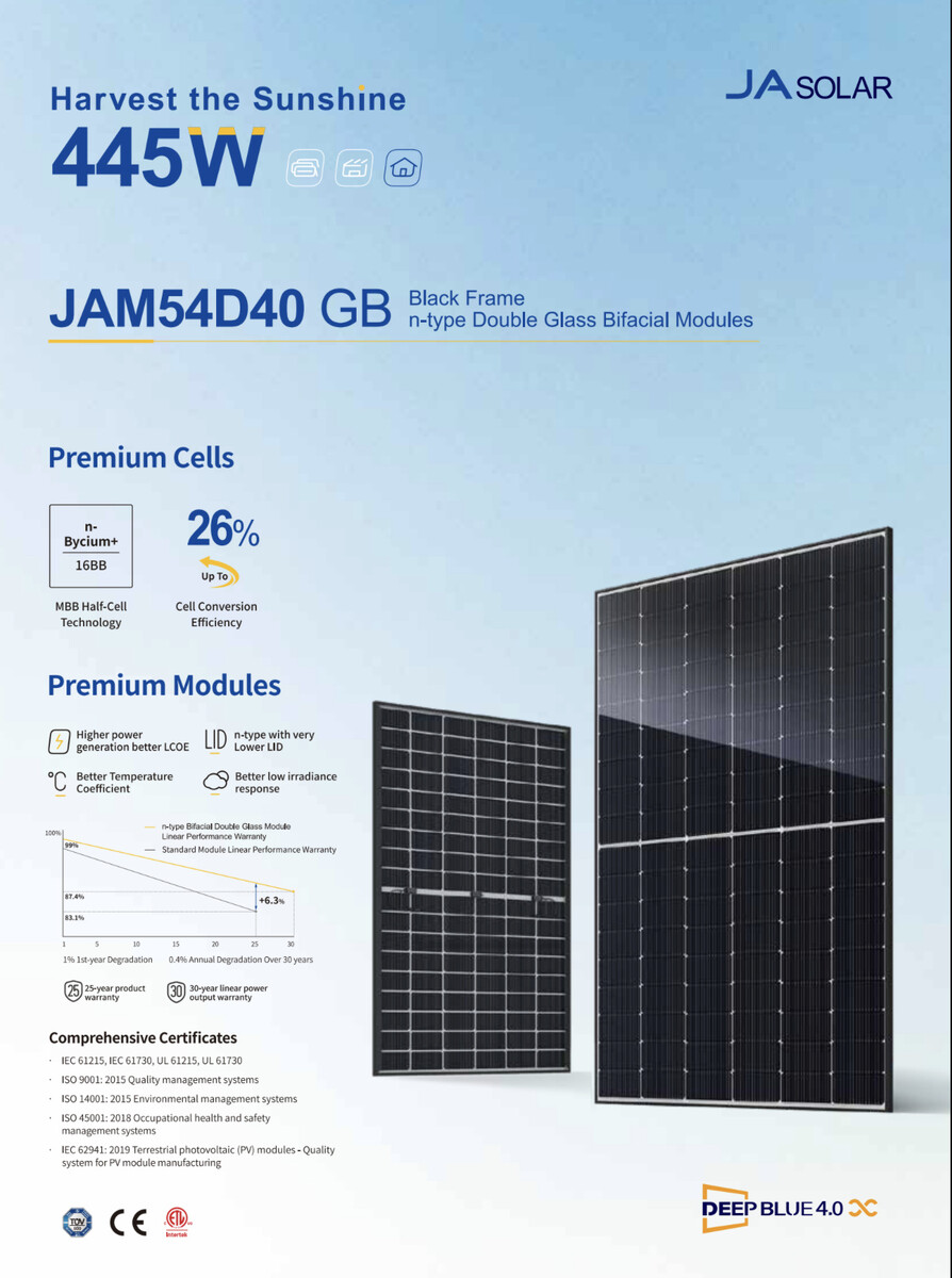 Es handelt sich um das Solarpanel JAM54D40/GB von Ja Solar mit einer Leistung von 435 Wp und Black Frame. Das Panel ist mit N-Typ-Zellen ausgestattet, die eine geringe lichtinduzierte Degradation aufweisen. Ein weiterer Vorteil der N-Typ-Technologie ist eine höhere Stromausbeute in den frühen Morgenstunden oder am Abend bei diffusem Licht.