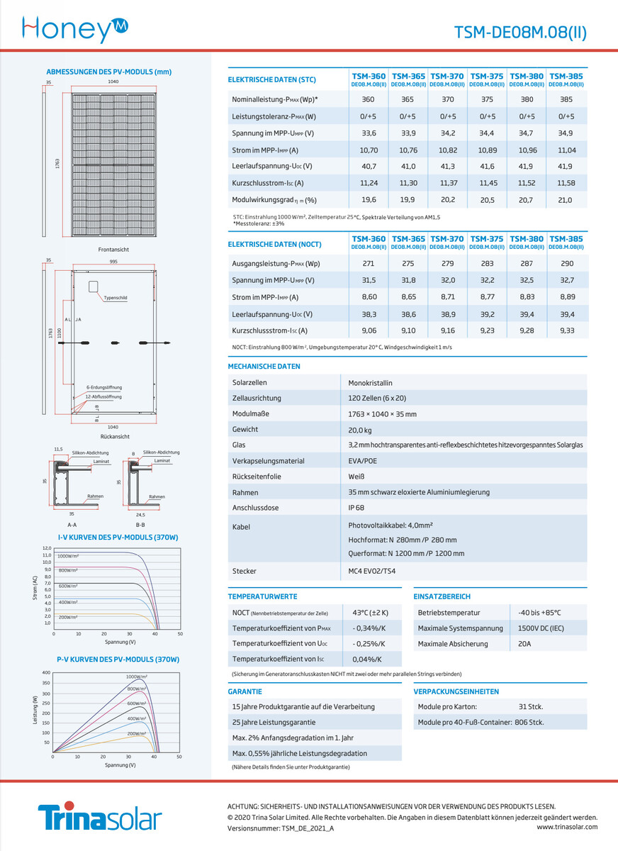 Das Solarmodul Trina Honey M TSM-DE08M.08 ist derzeit zum günstigen Preis für Selbstabholer oder bei einer Mindestabnahme von vier Modulen versandkostenfrei erhältlich. Dank hauchdünner, praktisch unsichtbarer Leiterbahnen sowie dem schwarz eloxierten Aluminiumrahmen bekommt das Modul einen schicken und diskreten Charakter.