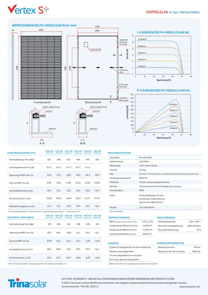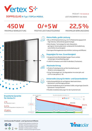 Konkret handelt es sich um das Modell TSM-450NEG9R.28 von Trina Solar mit einer Leistung von 450 Wp. Die Maße betragen 1.134 mm x 1.762 mm x 30 mm und der Modulwirkungsgrad liegt bei hohen 22,5 %. Durch die High-Density-Zellverbindungstechnologie wird die Verschaltung der Solarzellen innerhalb des Moduls optimiert, um eine höhere Effizienz, bessere Leistung und größere Zuverlässigkeit zu erreichen.
