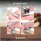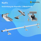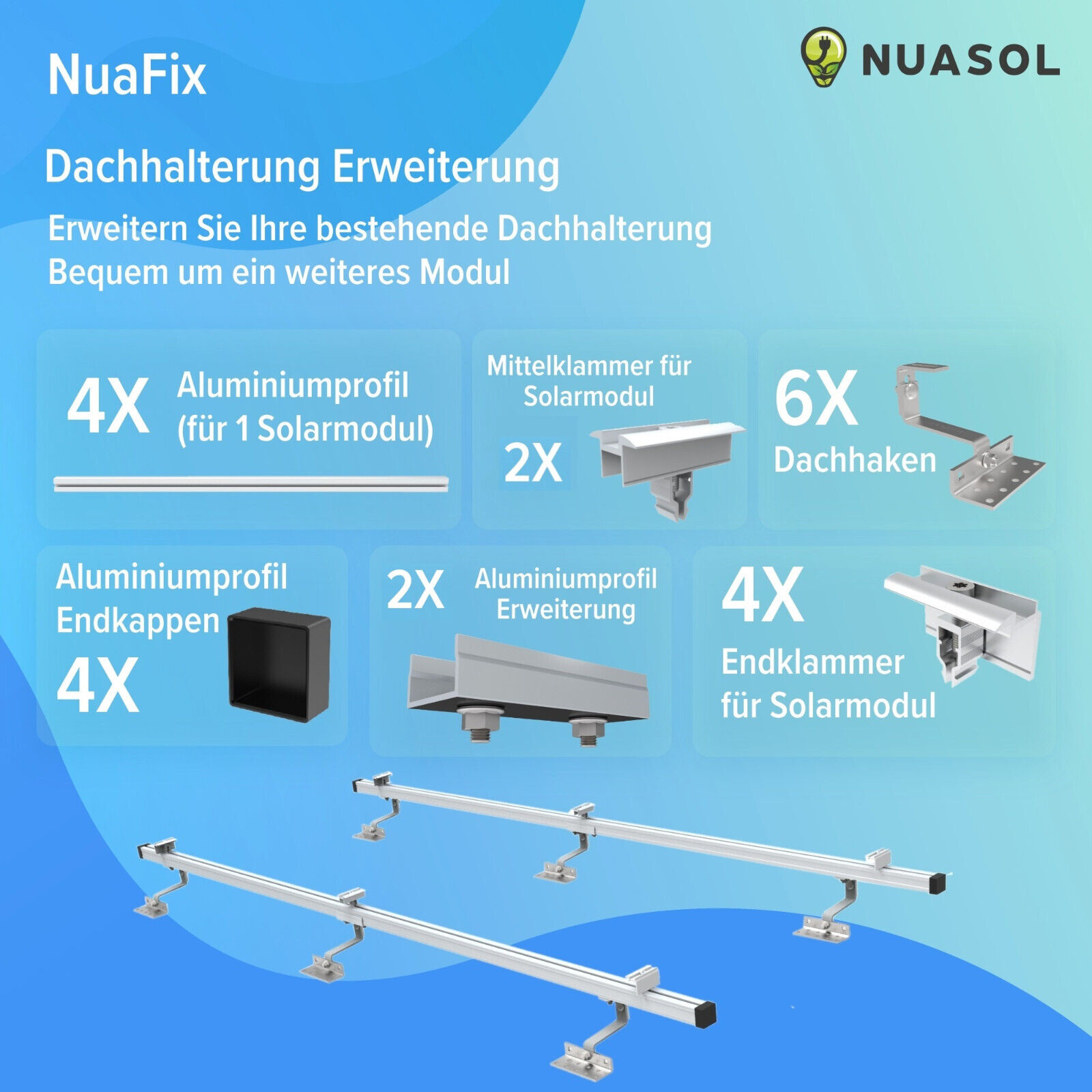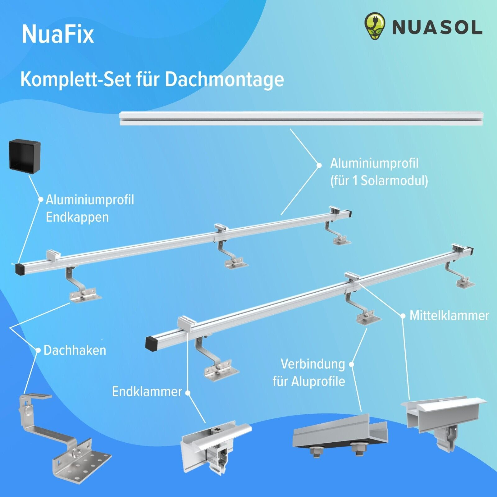 Im Lieferumfang des Nuasol-Sets sind enthalten: vier Montageschienen à 1.230 mm, zwei Schienenverbinder 40 x 40 mm, zwei Zwischenklemmen, vier Endklemmen, sechs Sechskantschrauben, sechs Flanschmuttern, sechs verstellbare Dachhaken (sechs L-Sockel, sechs Z-Stücke, sechs L-Gelenke, zwölf Tragschrauben M10 x 25 mm, zwölf Flanschmuttern M10), vier Schienenkappen und achtzehn Holzschrauben.