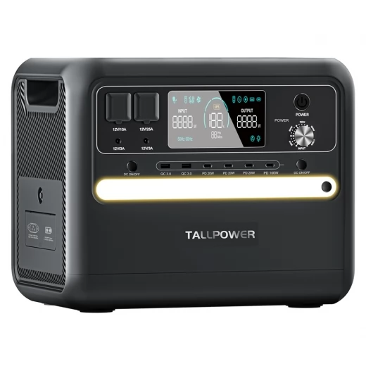 Etwas kompakter und leichter, somit einfacher zu transportieren, dafür aber auch etwas schwächer auf der Brust ist die Tallpower V2000. In dieser Powerstation verbaut der Hersteller ebenfalls einen langlebigen LiFePO4-Akku, der allerdings "nur" eine Kapazität von 1.536 Wh vorzuweisen hat. Die Energieabgabe erfolgt auch hier über bis zu 13 Anschlüsse samt zahlreicher USB-Ports. Die maximal bereitstehende Leistung an den Steckdosen fällt mit 2.000 W ebenfalls etwas geringer aus, langt aber dennoch für die Versorgung der meisten Geräte.