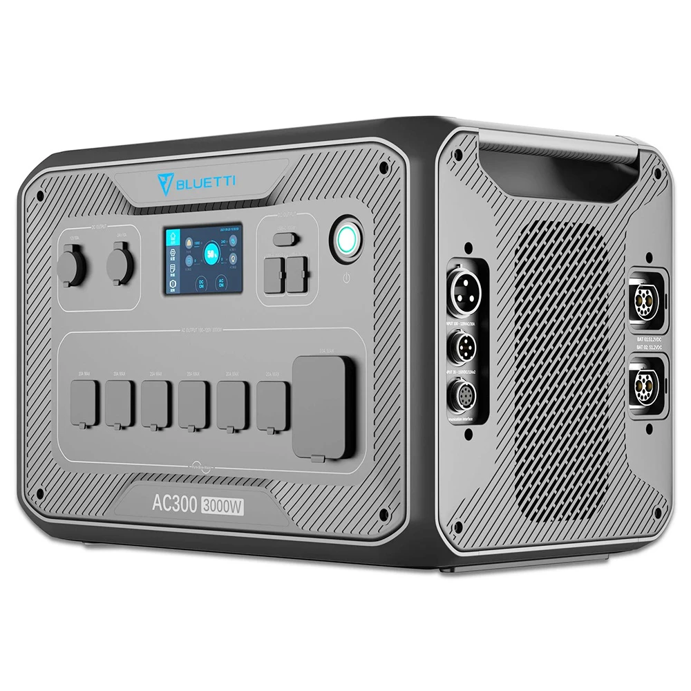 Der Solargenerator AC300 weist von Hause aus eine Kapazität von 3.072 Wh auf, ist aber erweiterbar. Der integrierte Wechselrichter bringt es auf eine Dauerleistung von bis zu 3.000 W. Mit den zahlreichen Anschlüssen samt sechs AC-Steckdosen und allerhand USB-Ports können viele Geräte zeitgleich mit Energie versorgt werden.