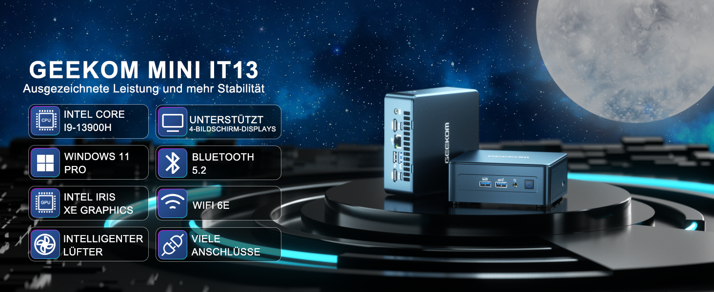 Der Geekom Mini IT13 bietet viel Leistung im kompakten Format. In dem nur 117 x 112 x 49,2 mm messenden Gehäuse mit einem Gewicht von 652 g werkelt der starke Intel Core i9-13900H. Der Prozessor der 13. Generation von Intel wartet mit 14 Kernen, 20 Threads, 24 MB Cache und einer Taktrate von bis zu 5,4 GHz auf.