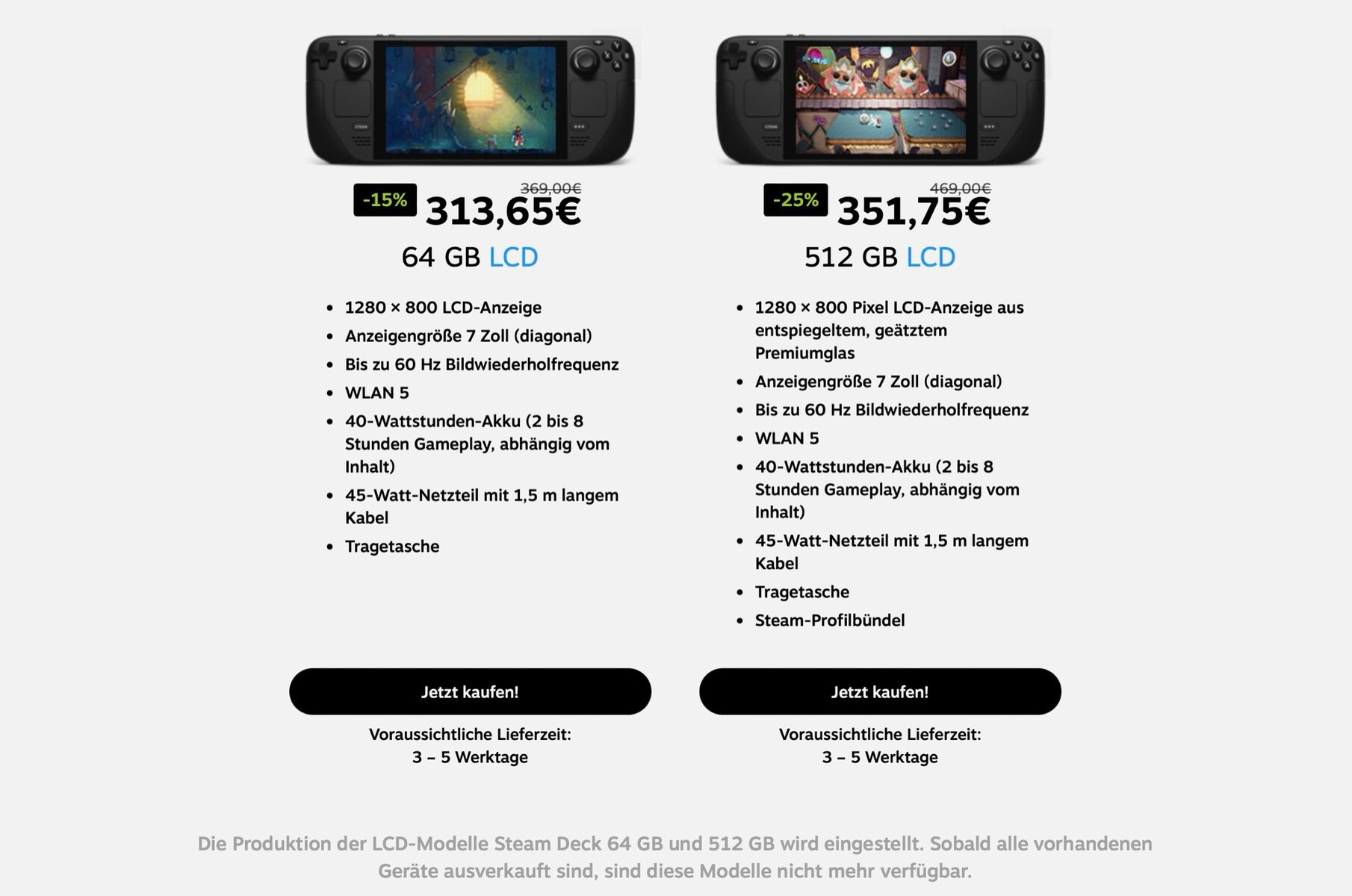 Der Aufpreis von rund 38 Euro auf 512 GB Speicher lohnt sich durch diese Aktion durchaus, denn selbst eine günstige 512 GB microSD-Speicherkarte kostet aktuell rund 37 Euro auf Amazon. Sobald die Lagerbestände dieser beiden Modelle erschöpft sind, wird das 256 GB Steam Deck LCD zum günstigsten Gaming-Handheld von Valve, und das zum Preis von 419 Euro. Das 512 GB Steam Deck OLED kostet nach wie vor 569 Euro.