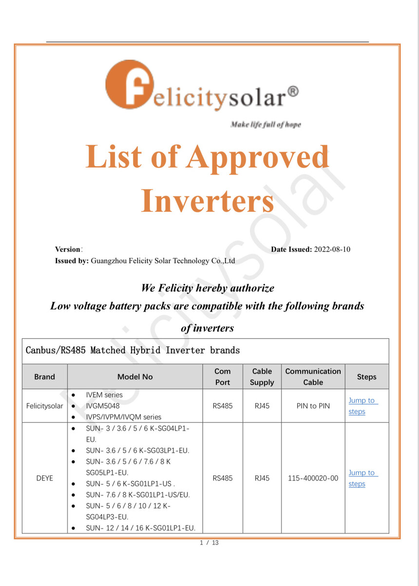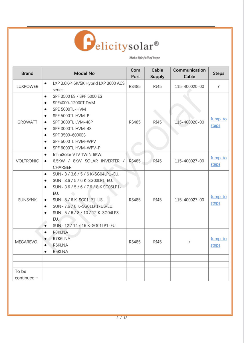 Es besteht Kompatibilität zu verschiedenen Wechselrichterherstellern wie Felicitysolar, Deye, Luxpower, Voltronic, Sunsynk, Megarevo, Growatt, Victron und anderen, eine vollständige Liste ist weiter unten aufgeführt. Man sollte jedoch beachten, dass selbst dann, wenn theoretisch eine Eignung für bestimmte Modelle gegeben ist, die Umsetzung unter Umständen mit einem hohen Aufwand an Recherche und Bastelei verbunden sein kann.