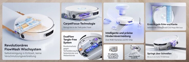 Dazu gesellt sich die mit 22.000 Pa extrem hohe Saugleistung, die dank CarpetFocus-Technologie den Dreck auch aus Teppichfasern heraussaugt. Die erweiterte dynamische Seitenbürste mit verwicklungsfreier Funktion fegt bis in die hinterste Ecke, während der Wischmopps randlos wischt.