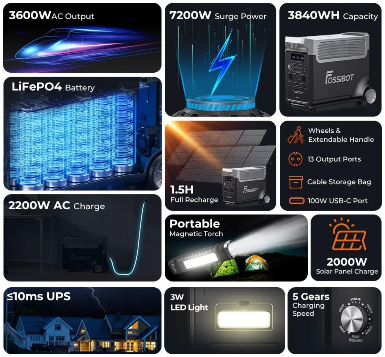 Die FOSSiBOT F3600 bietet einen 3.840 Wh großen Akku und erzeugt mit dem verbauten Wechselrichter eine AC-Leistung von bis zu 3.600 W. Insgesamt stehen 13 Anschlüsse zur Verfügung, sodass sich allerhand Geräte mit viel Leistung versorgen lassen. Eingesetzt werden kann die Powerstation unter anderem beim Camping, aber auch zuhause im Garten oder bei einem Stromausfall. Für einen leichteren Transport ist das Gerät neben zwei Tragegriffen auch mit einem Teleskopgriff sowie zwei Rädern bestückt.